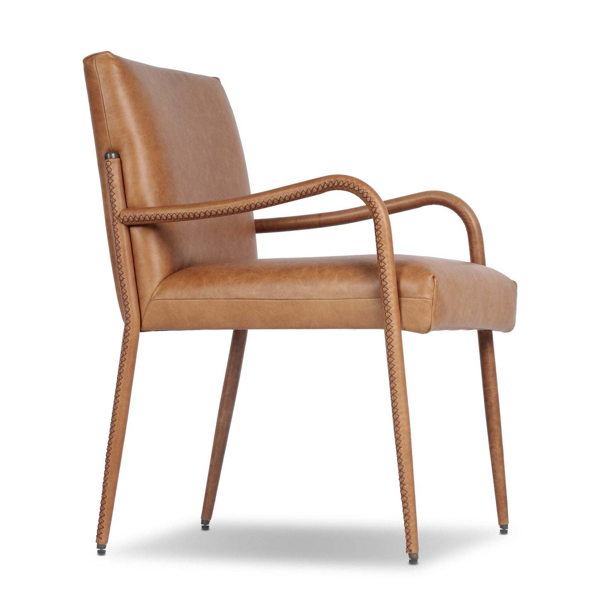 The Quill Dining Armchair combines refined simplicity with enduring craftsmanship. Wrapped entirely in rich butterscotch top-grain leather that develops character over time, this streamlined silhouette offers both style and substance. Leather-clad iron legs showcase meticulous stitching details, while wooden armrests provide a natural accent perfect for commanding a dining table. A chair that honors quality materials and thoughtful design.