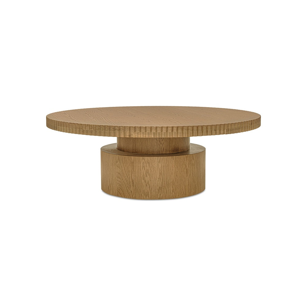 Layne Coffee Table commands attention through assertive proportions and considered structural composition. The substantial circular tabletop features a distinctive scalloped perimeter that introduces visual playfulness while maintaining refined restraint. A stacked cylindrical base achieves equilibrium between visual lightness and anchoring presence, constructed from oak veneer over MDF with solid oak edging for durability and authentic material expression. Engineered for quotidian use, this coffee table balances sculptural presence with practical functionality, serving as both conversation focal point and reliable surface for daily living.