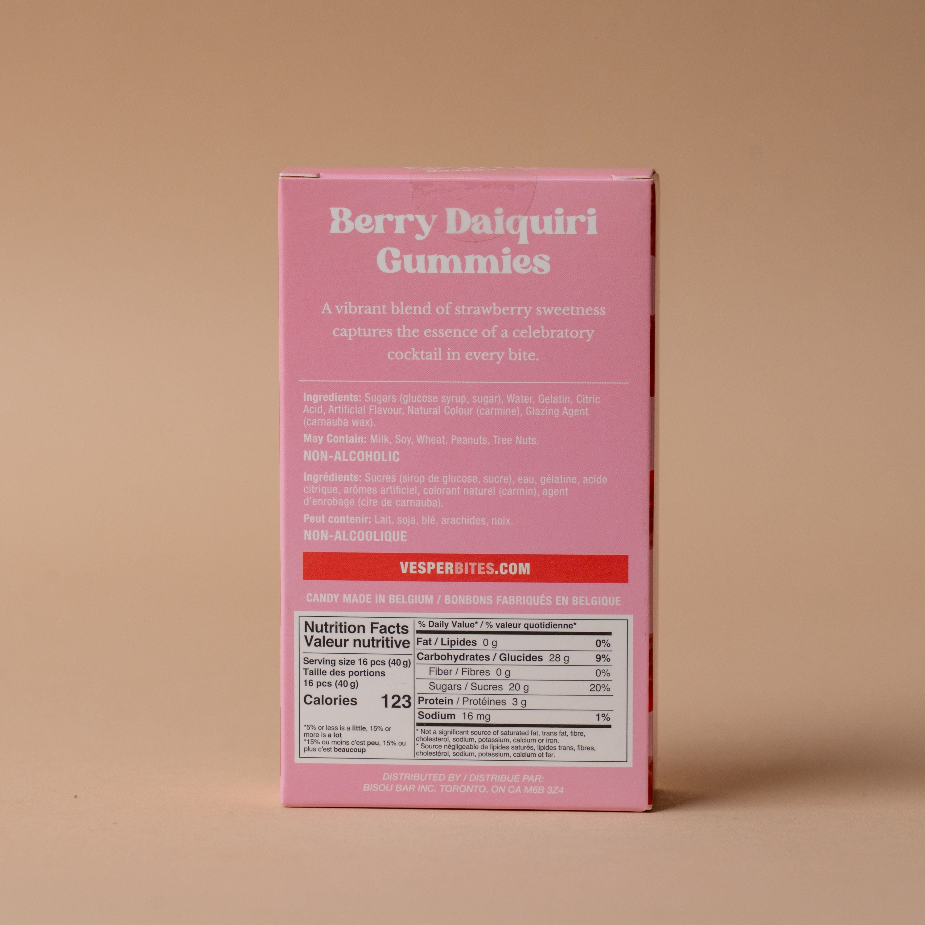 Berry Daiquiri: Sugars (glucose syrup, sugar), Water, Gelatin, Citric Acid, Artificial Flavour, Natural Colour (carmine), Glazing Agent (carnauba wax)