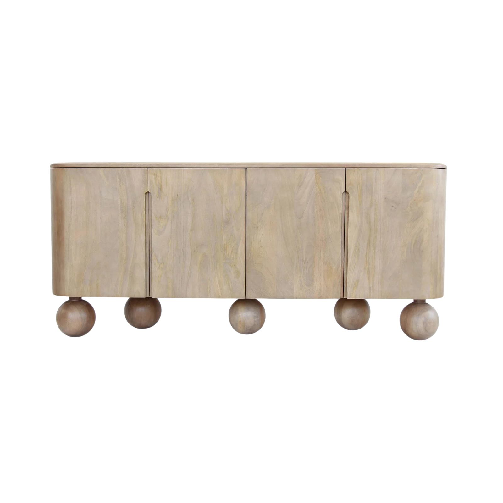 Add a touch of contemporary elegance to your dining space with the Gianna Sideboard. Crafted with care from solid mango wood, this sideboard features a beautiful natural finish and four doors for ample storage. The curved and rounded design, along with the unique globe legs, make for a trendy and statement-making piece.