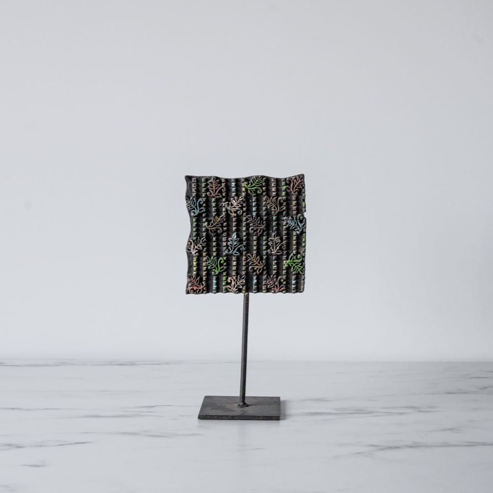This is an extremely unique piece and special to Rug & Weave. Many of our pillows are made from block printing fabrics through our artisan partners in India and this object is a mold for a floral block print that would be used for this process. This is a beautiful one-of-a-kind decor piece for your home that would look stunning on a dresser, mantle or shelving unit.