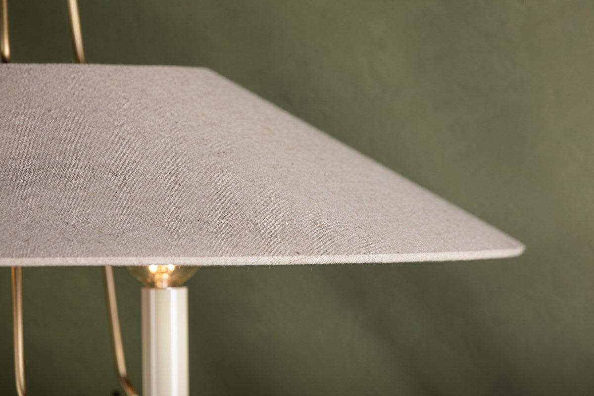 Make a statement with this stunning light that reimagines the traditional ring chandelier. A trio of candles are displayed around a metal ring held aloft by delicate hooked arms. The natural linen shade over the framework is unexpected and adds an organic feel and a soft light.