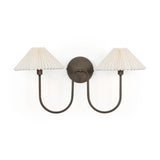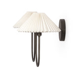 French inspiration courses this slim double sconce, as two curved bronzed arm extend from an iron backplate. Cream, accordion-pleated linen shades allow for a softened, more ambient light. T6 bulb recommended.