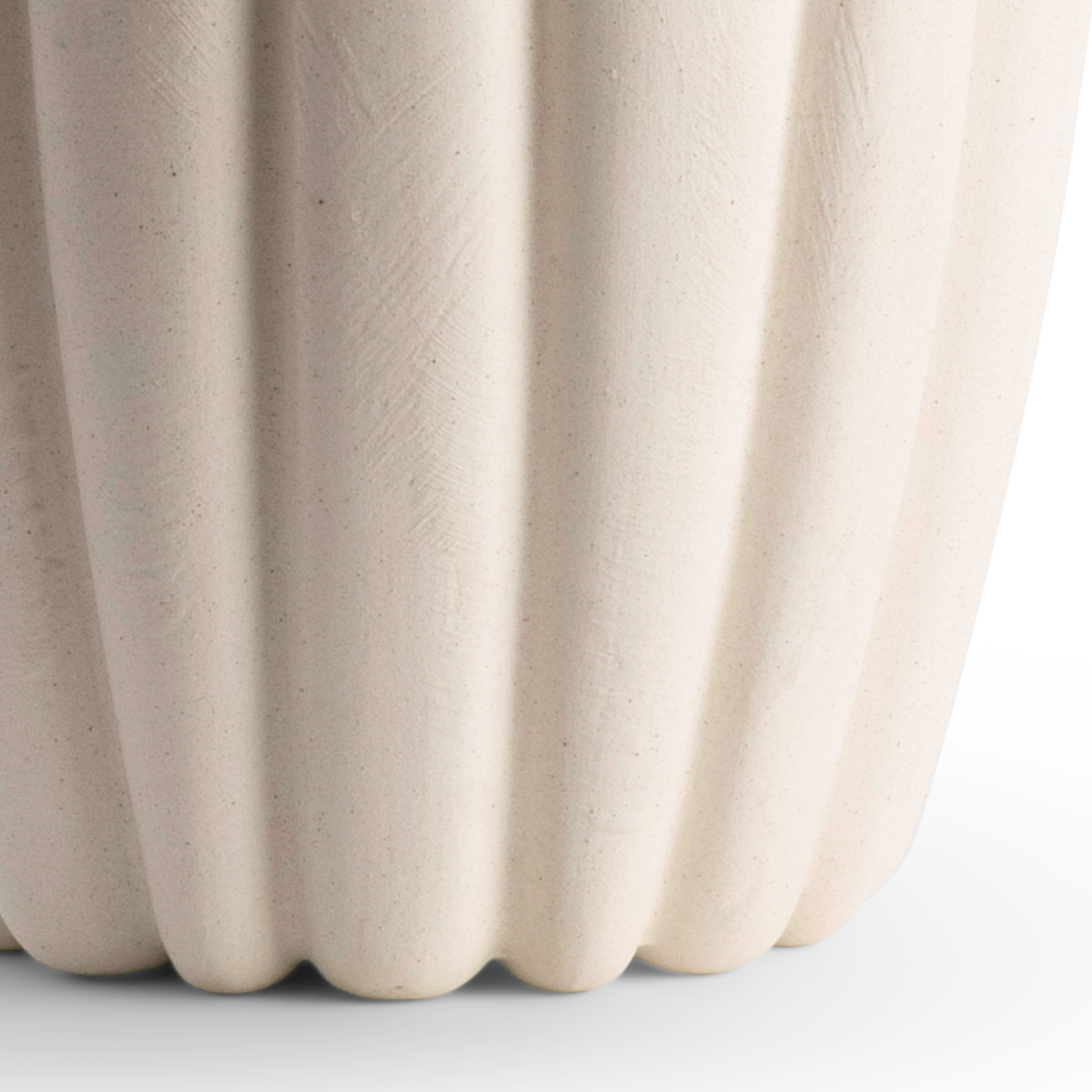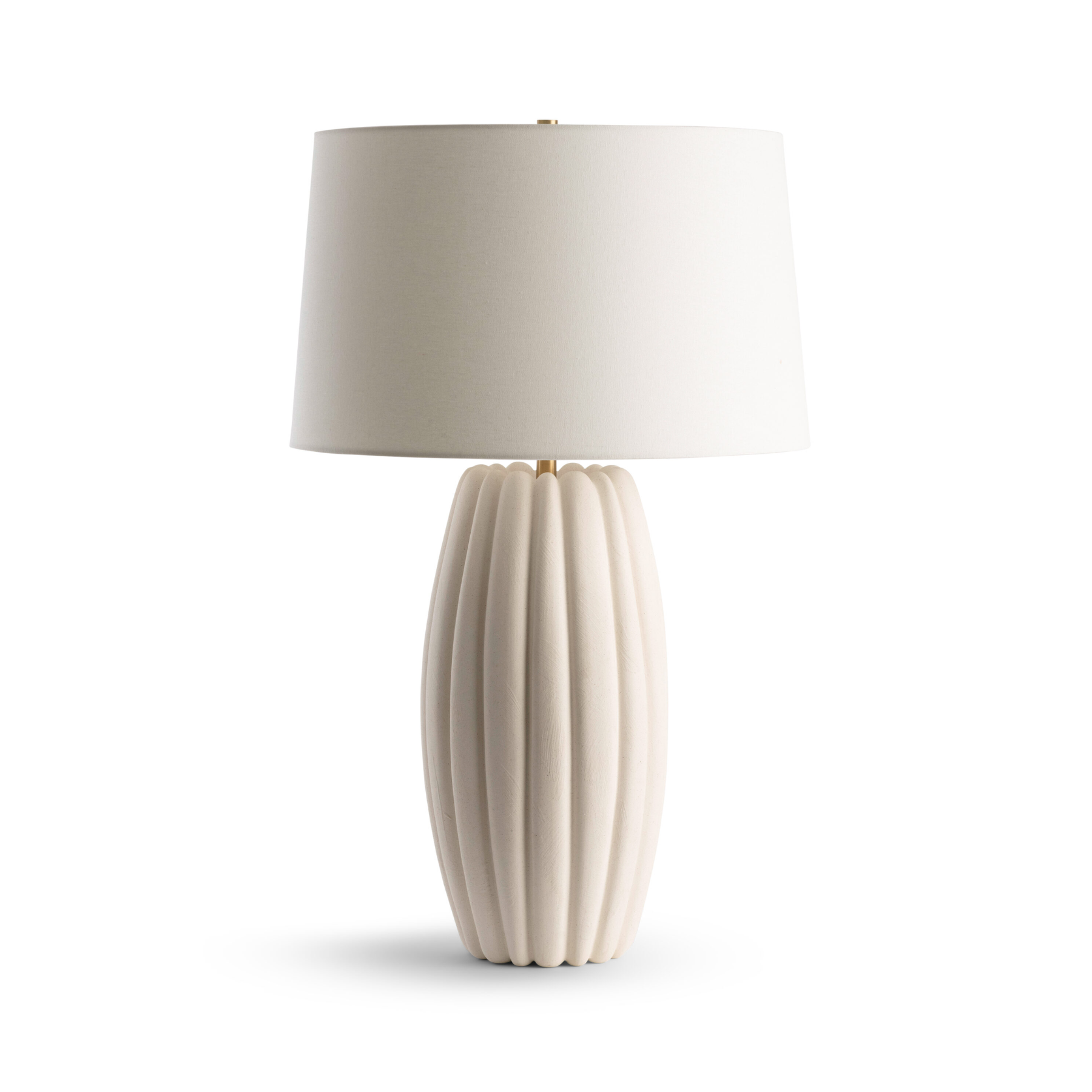 The Bernese Table Lamp features smooth grooves extending along its lightly textured ceramic base, finished in a refined off-white with subtle brush strokes. Its design culminates in delicately scalloped edges, paired with a tapered drum shade in coordinating linen. This lamp offers a sophisticated accent that seamlessly enhances elevated contemporary interiors with understated elegance.