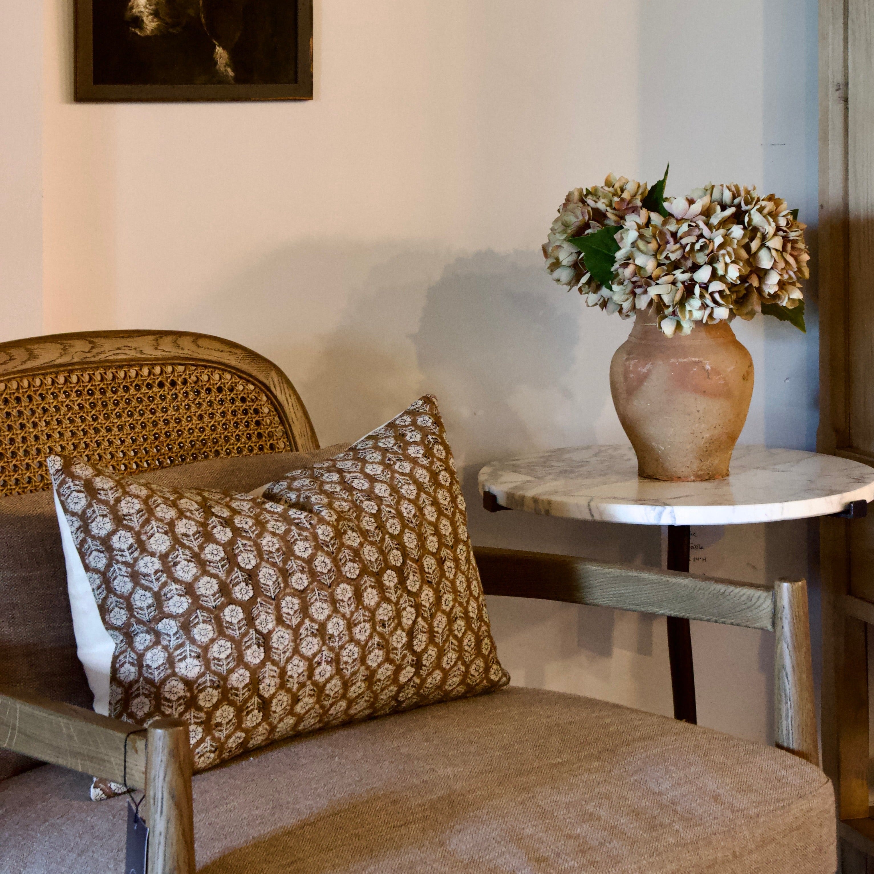 Experience the beauty and charm of our Betsy Block Print Pillow Cover. With a small floral print on a warm background, this hand block printed textile will add a touch of natural elegance and whimsy to your home. Crafted by our talented artisan partners in India, this textile showcases the art and skills that create this unique pillow cover.