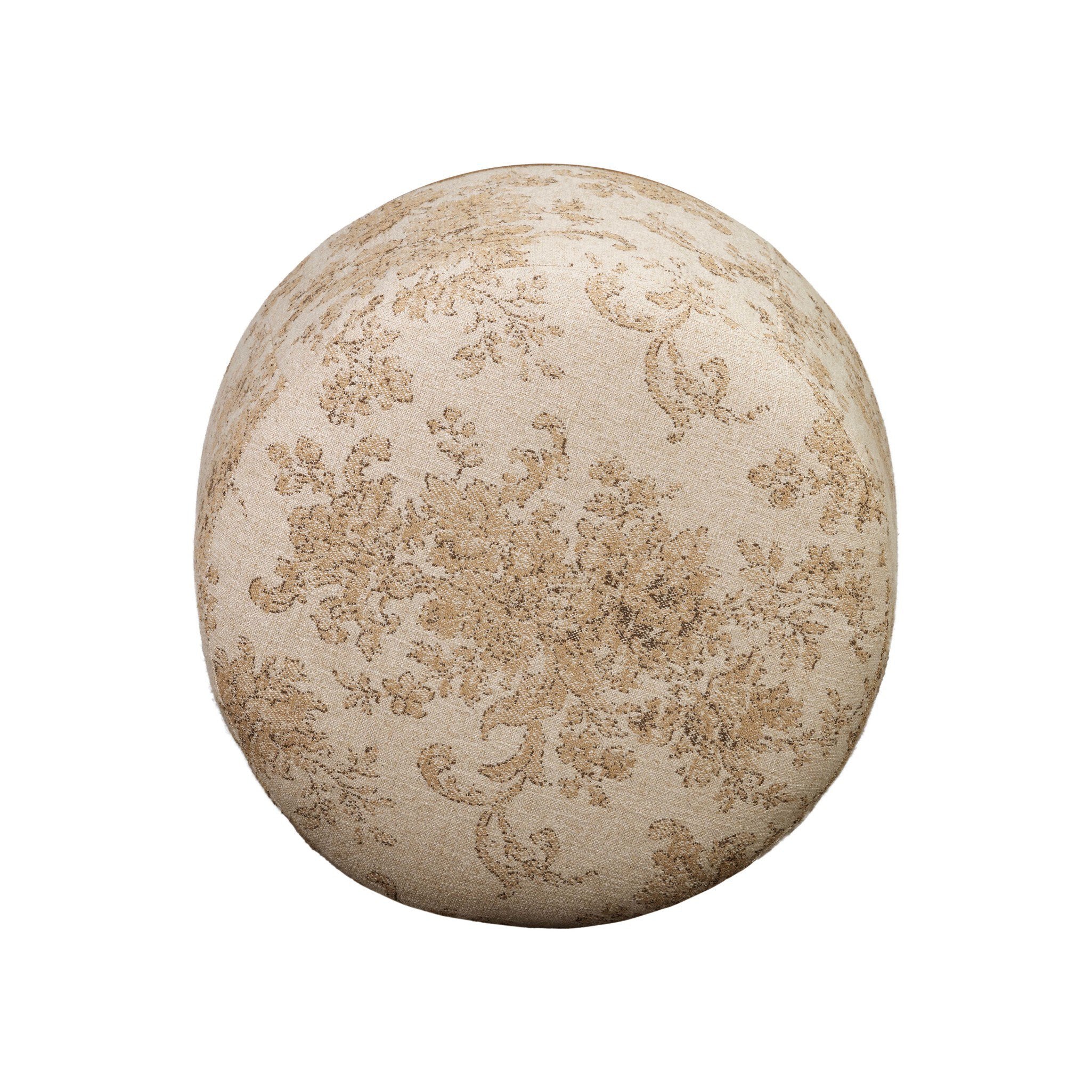 For an extra seat or propped feet, this welcoming ottoman features a subtly tapered shape and a rounded base with bun feet beneath. Crafted from almond-finished oak and upholstered with a linen blend fabric that features a beautiful damask pattern.