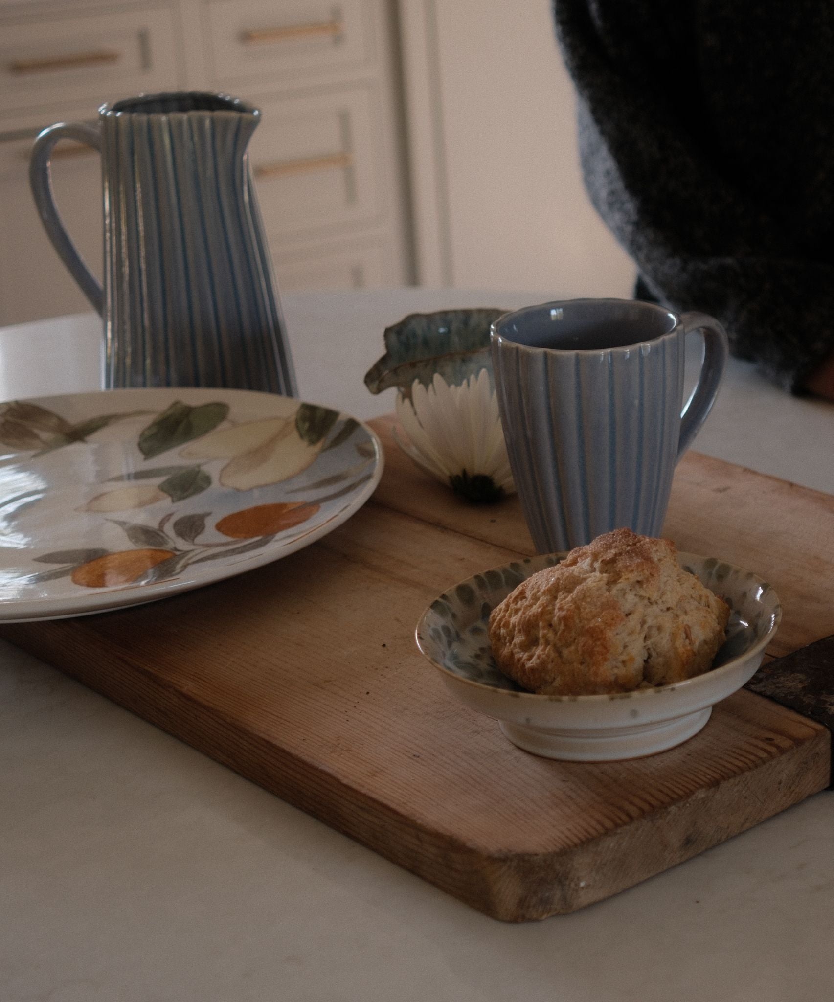 Blue Ribbed Stoneware Pitcher