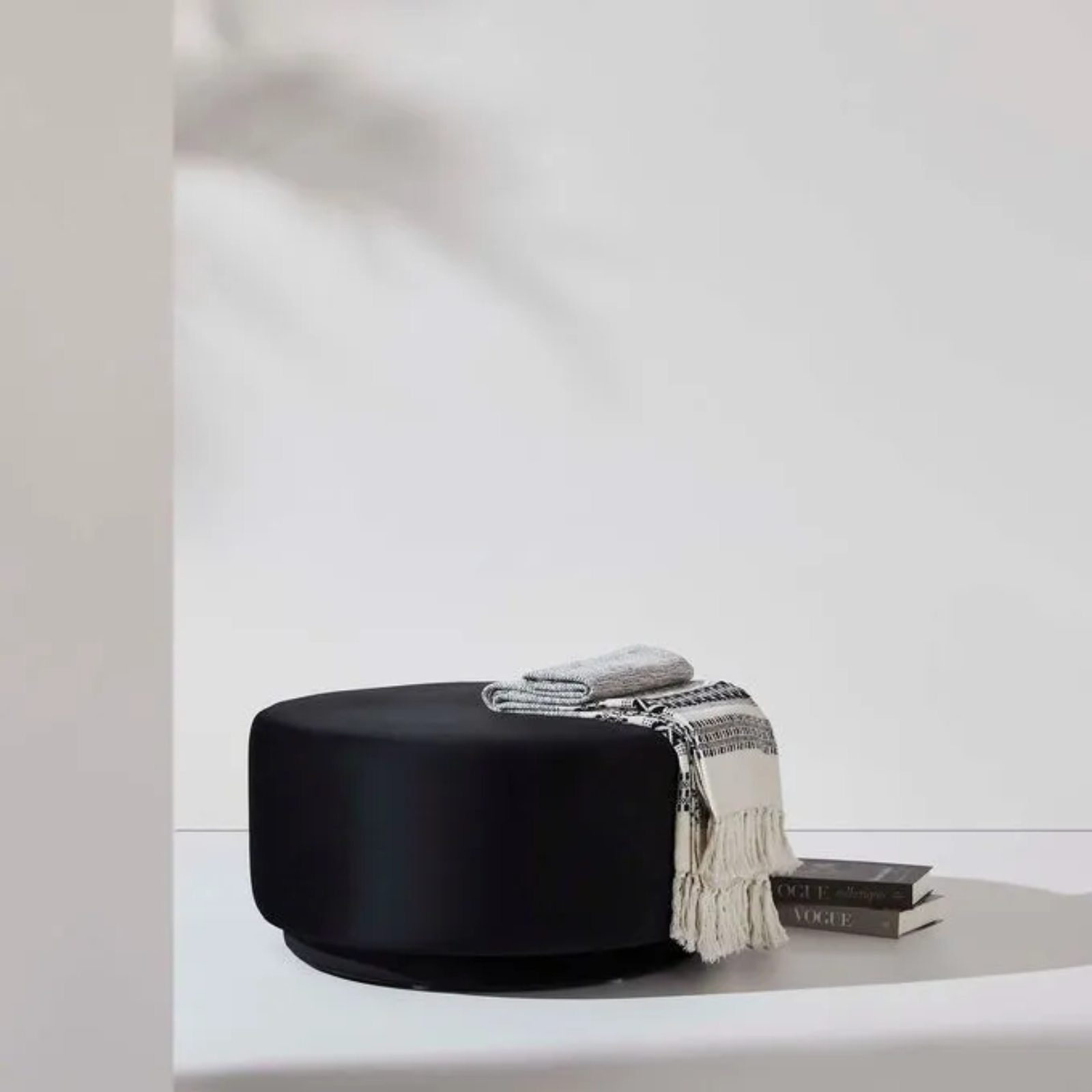 Transform your bedroom or living room with the effortless elegance of the Callum Ottoman. The poly-velvet black finish adds a touch of luxury while the soft, naturally inviting fabric makes it perfect for a footrest or seat. With its versatility, this ottoman can serve many purposes in your home.