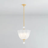 Cambria Heights offers a delicate and light silhouette, introducing natural elegance to your ceiling. Its misty Sfumato glass shade, featuring softly scalloped edges, seems to hover effortlessly in both pendant and lantern designs. Enhancing its artistic appeal, a gem-like rock crystal accent adds a refined touch. The fixture’s Aged Brass central rod ensures a polished and sturdy framework for this graceful lighting piece.