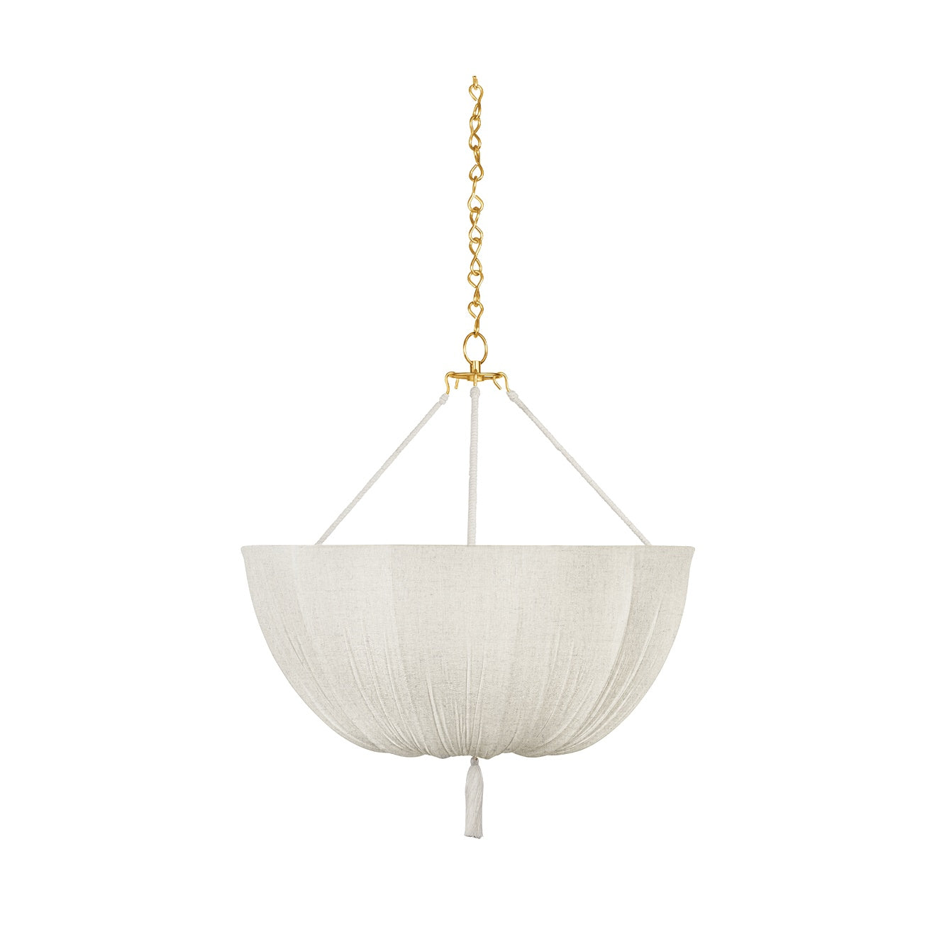 The Carolina pendant explores proportion and materiality with quiet confidence. The generous, soft form of the raw silk is eye-catching and special as it overlays a clear etched glass shade. The wrapped rods and matching tassel further add to the striking, airy material story. Accented by Aged Brass hardware, Carolina’s warm, luxurious presence makes for a dreamy piece in dining areas and bedrooms.