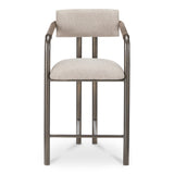 The Chami counter stool features a wishbone-shaped frame and a double-beamed back, offering both stylish appeal and supportive comfort. Its plush seat, upholstered in soft light brown fabric, harmonizes seamlessly with the blackened bronze frame, while the dark brown leather armrests develop a distinctive patina with use.