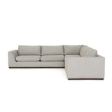 A simply styled three-piece sectional, fit for everyday lounging. Upholstered in a textural poly/linen blend covering, with subtly flared sides and a plinth-style, wrapped wooden base.
