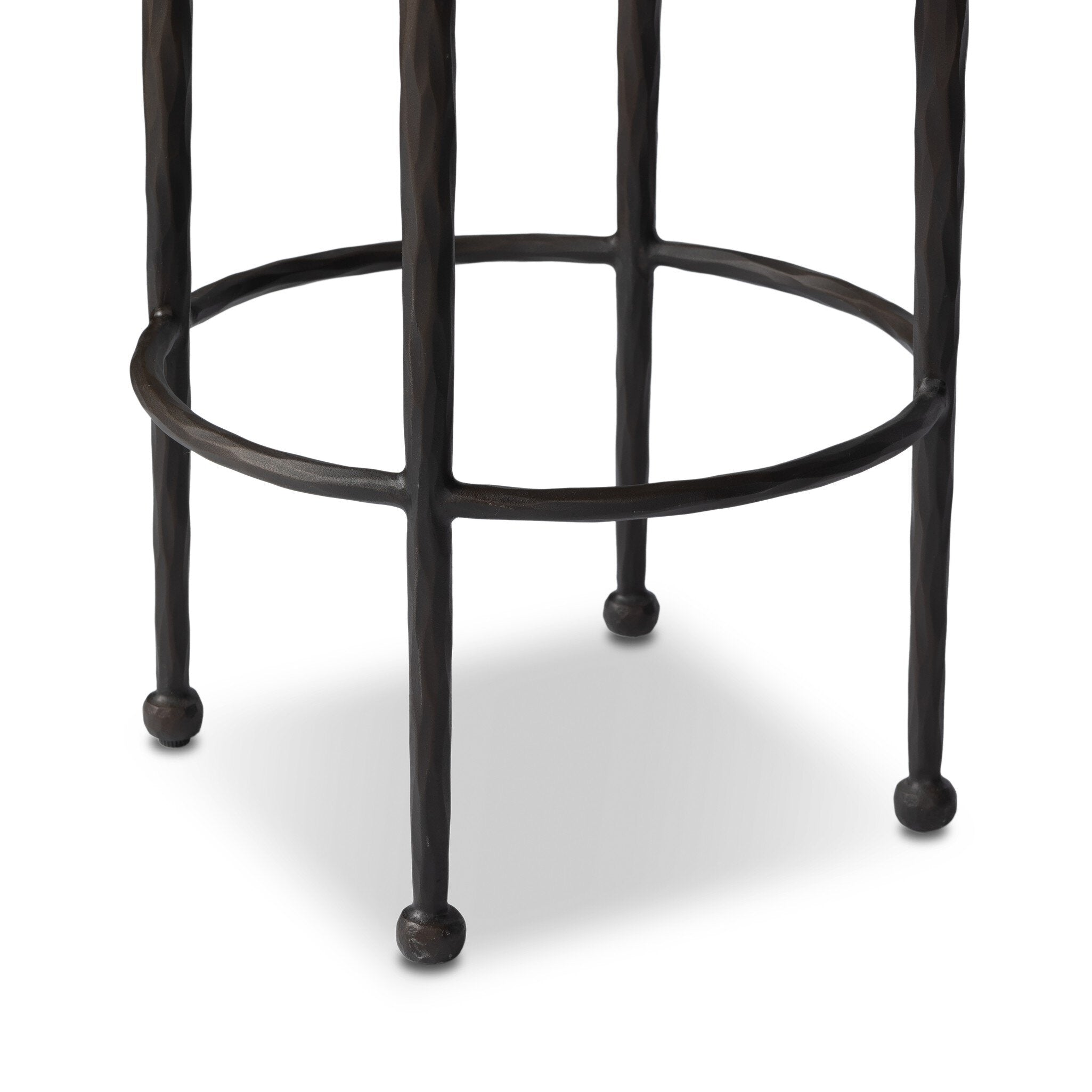 Hammered iron legs with ball-shaped foot details elevate this simply shaped counter stool. A round, cushioned seat upholstered in performance fabric offers a clean, inviting look. Performance fabrics are specially created to withstand spills, stains, high traffic and wear, ensuring long-term comfort and unmatched durability.