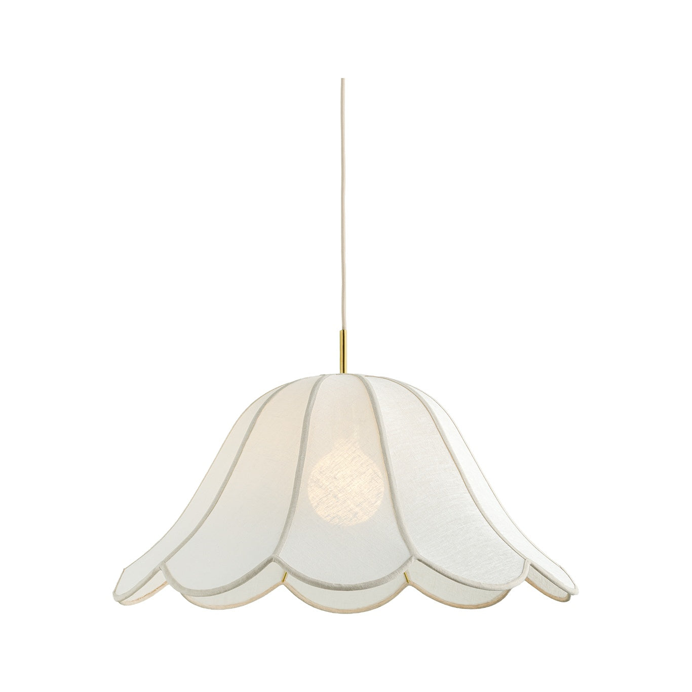 Softly floral, the Dara pendant floats overhead with its pillowy, scalloped silhouette. The voluminous inverted edges that make up the ‘petals’ spread light dynamically around the piece. Natural trim, shade tape, and cord wrap add tonal interest and texture to the crisp white linen. An Aged Brass accent adds a luxurious finishing touch to the romantic form. Available in two sizes.