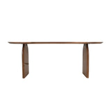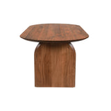 This dining table showcases a striking organic design, expertly crafted from solid acacia wood featuring gentle curves and carefully shaped edges. Its oval tabletop paired with panel legs creates a sturdy, architectural feel while preserving a welcoming natural warmth.