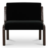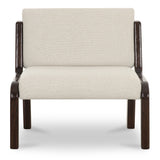 The Eagan accent chair artfully combines vintage charm with modern sophistication. Its streamlined armless form is influenced by mid-century styles, updated with contemporary finishes for today’s interiors. Plush, textured upholstery envelops a spacious seat, complemented by a high-gloss solid ash frame in a deep dark brown, lending a striking and refined presence.