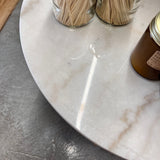 Light, bright and modern. An airy, sculptural star base of honey-finished oak supports a rounded tabletop of solid white marble, for a freshly versatile look.