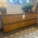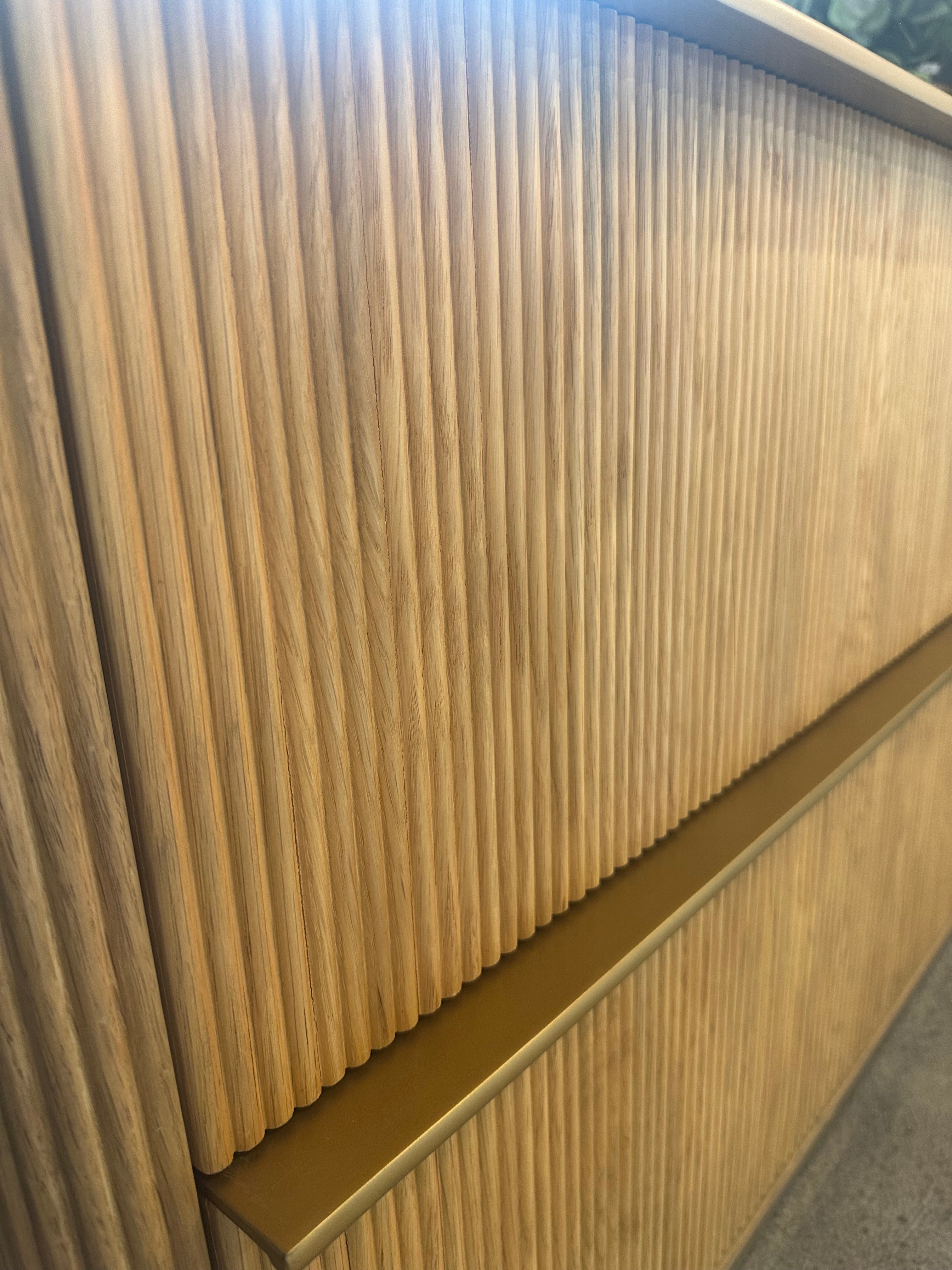 The Kaia Dresser harmoniously combines form and function. Boasting a rustic oak veneer with vertical reeding, the dresser is elevated by a gold steel base. Being a natural material, wood may have variations in texture, indentations, cracks, colour, grain, knots, and burls, adding unique character to each piece.
