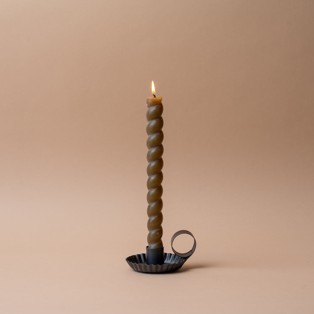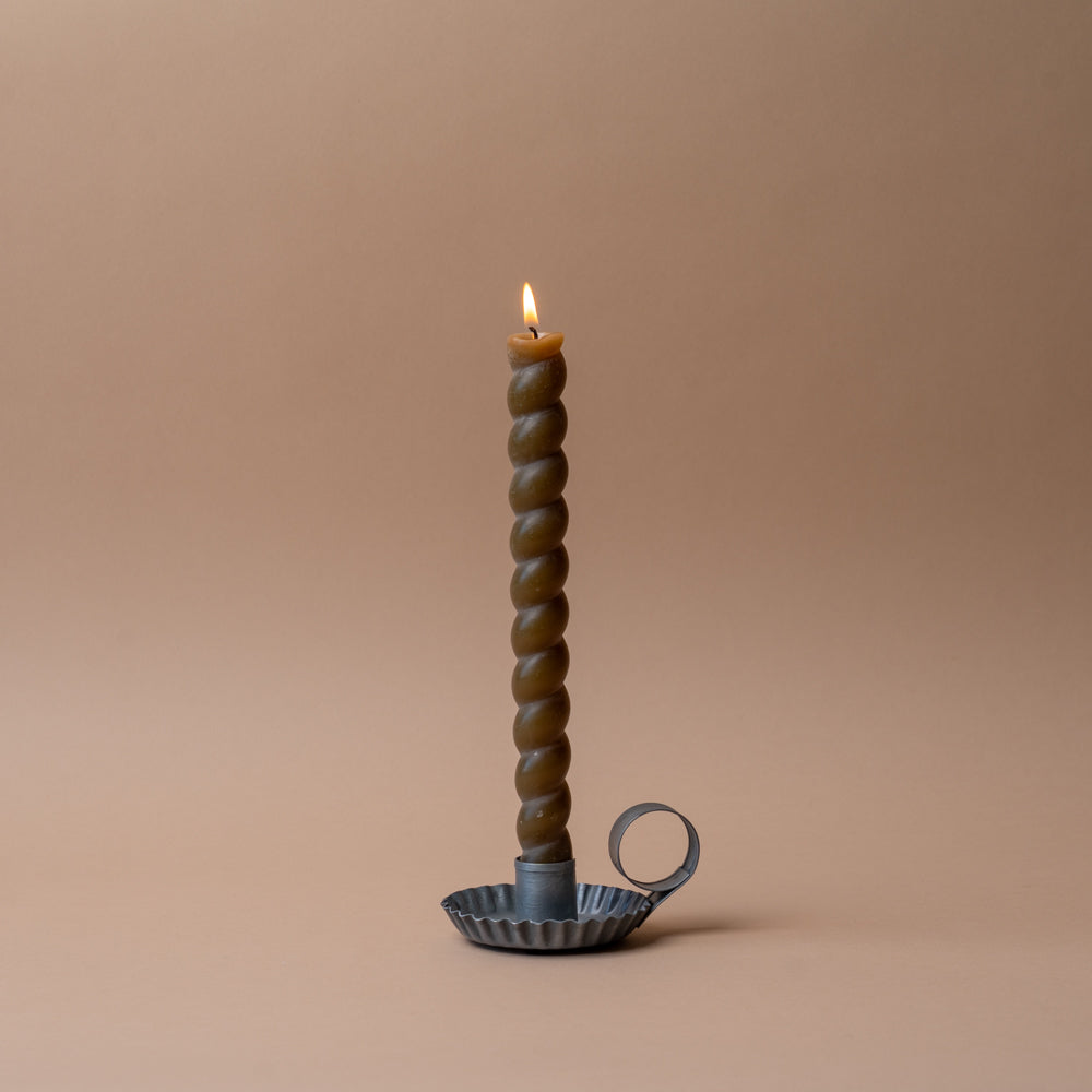 This tin candle holder marries rustic charm with a classic feel through its distinctive fluted detailing and traditional chamber stick silhouette. The vertical ribbing creates visual depth while the integrated handle offers both practical convenience and authentic period appeal.