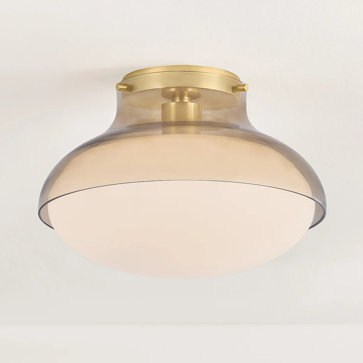 The soft curves and mechanical detailing of Gianna create visual tension while retaining a sense of balance. A light bronze glass layer melts from an Aged Brass canopy, surrounding a glossy opal glass inner shade to form the organic design. The clean, minimalist shape is elevated by the distinctive double glass composition and the industrial-style pins that hold the entire fixture together.