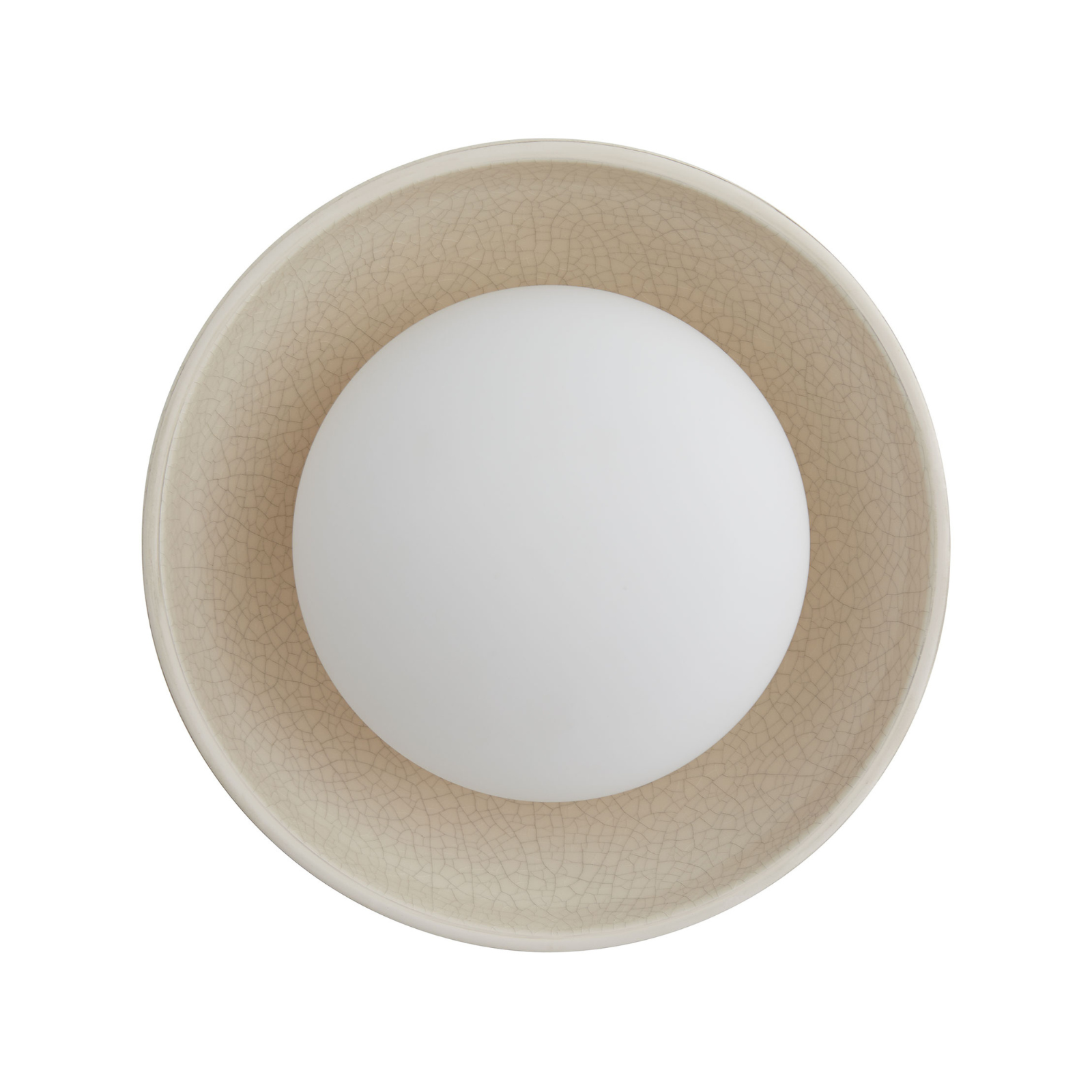 The Glaze Small Flush Mount light pairs soft opal frosted glass with a satiny ceramic shade elevated by a fine, subtle ivory stained crackle inspired by hand-crafted tableware and fine ceramics that reveal the hand of the maker. Compelling enough to stand alone, the small flush mount also offers endless possibilities when installed in multiples or in combination with the Glaze large flush mount fixture and Glaze sconces.