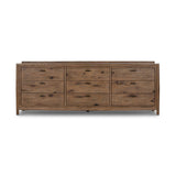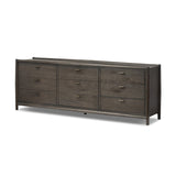 This dresser combines traditional spindle design with a modern touch. Crafted from weathered oak with a rustic finish, it features nine roomy drawers for ample bedroom storage. The simple hardware, finished in aged bronze, adds a touch of classic style.