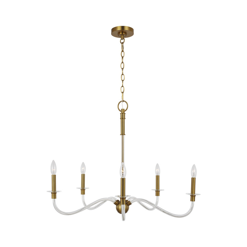 The Hanover Medium Chandelier features elegant, slender curved arms crafted from clear acrylic, seamlessly paired with warm brass accents. This combination creates a sophisticated, modern silhouette that enhances ambient lighting while adding a refined touch to your space. Ideal for elevating dining rooms or entryways, it balances transparency and metallic warmth for a distinctive, timeless appeal.