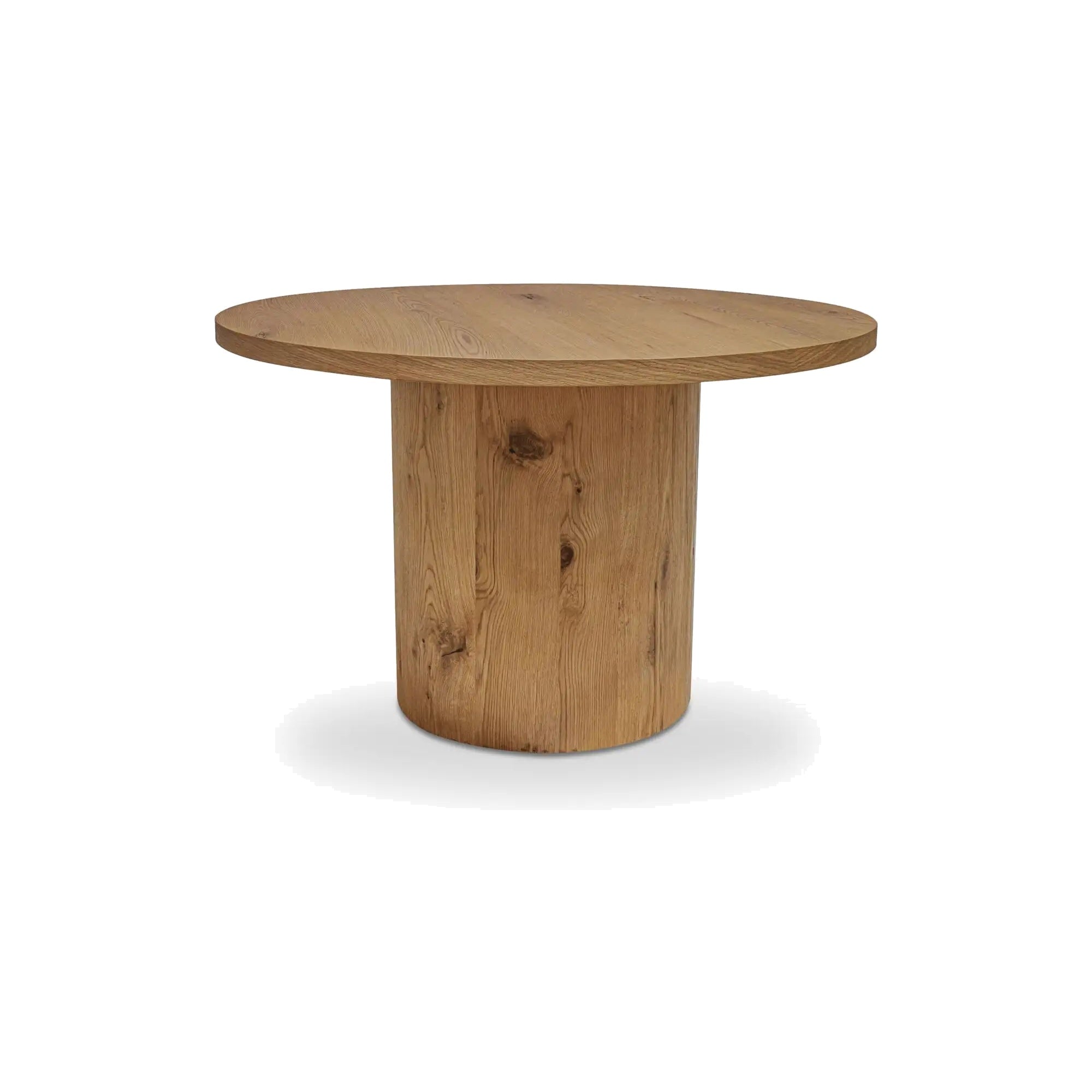 A round dining table with clean, modern design. The sturdy pedestal base supports a spacious top with a distinctive edge detail. Finished in rustic oak for warmth and character, it combines minimalist style with solid construction and timeless appeal.