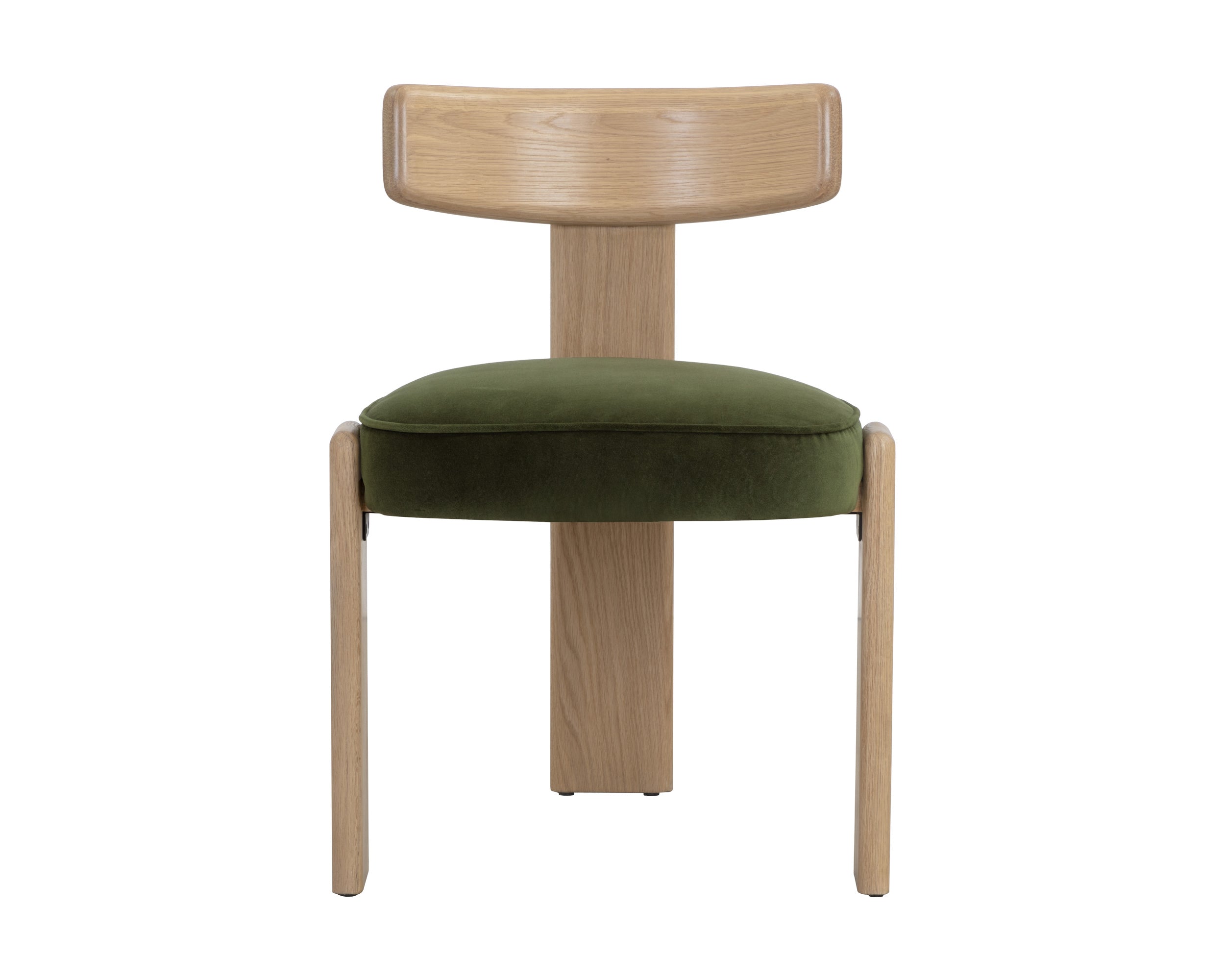 The Horvel Dining Chair showcases the elegance of minimalist contemporary design. Its sculpted three-legged frame and curved back, crafted from dark brown oak wood, cradle a seat upholstered in our premium sahara sand top-grain leather for exceptional comfort.
