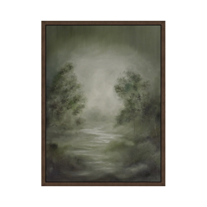 Twilight Forest is a framed, stretched canvas showcasing a moody landscape in deep shades of green, set beneath a softly glowing moonlit sky. The layered brushwork and muted palette create a sense of calm drama, while the quality frame enhances its timeless appeal. Perfect for adding warmth and atmosphere to living spaces, bedrooms, or studies.