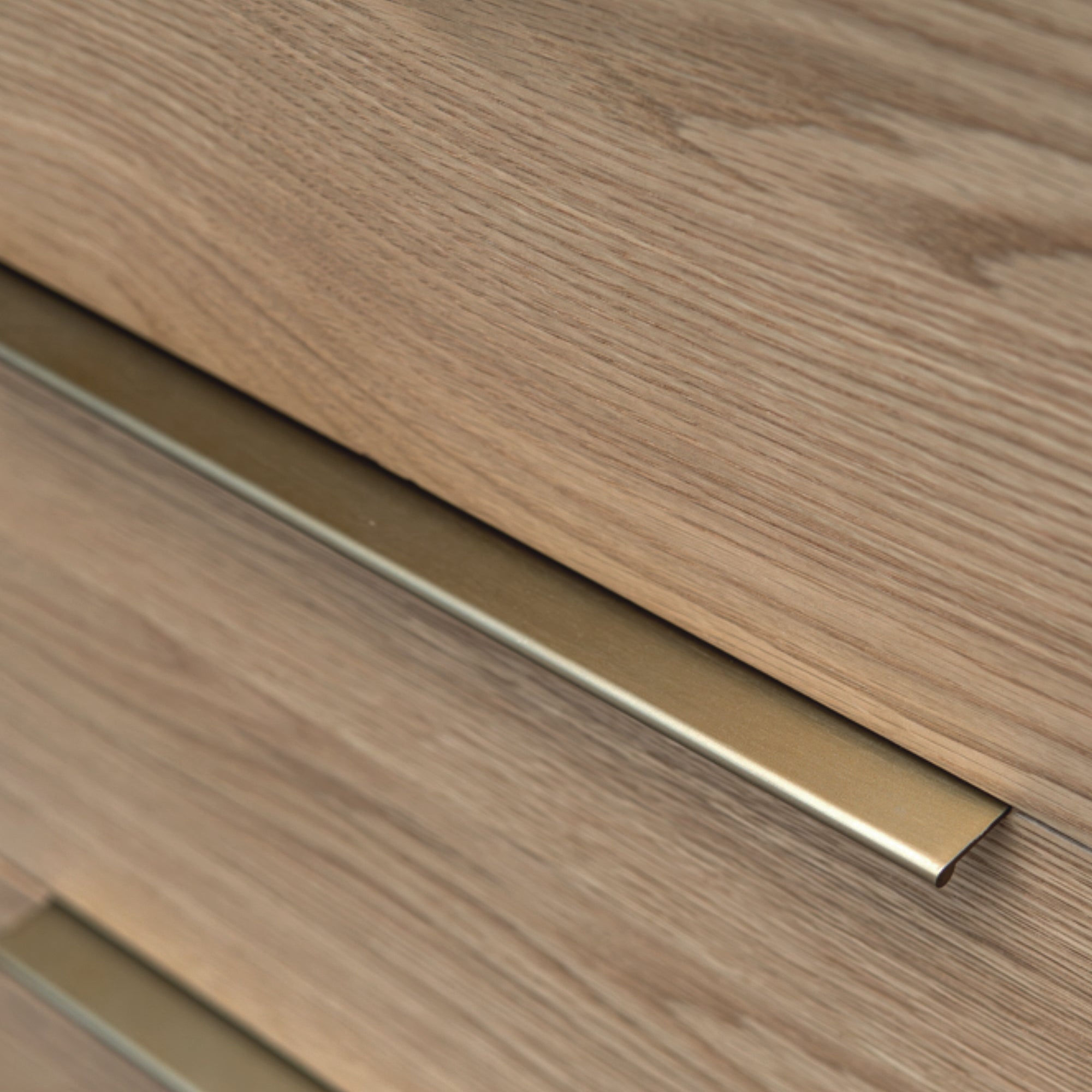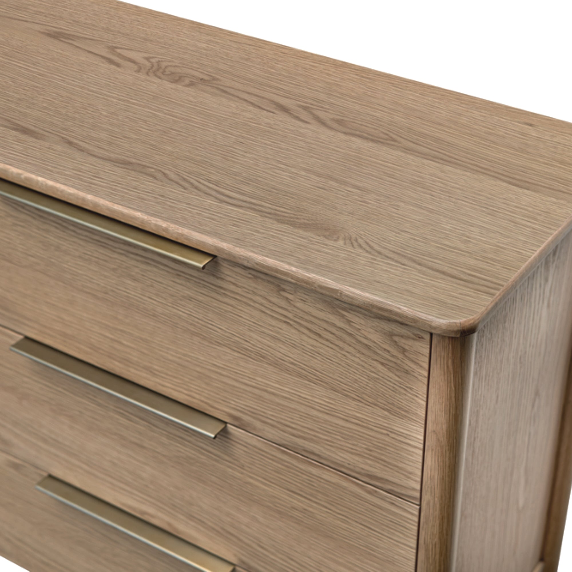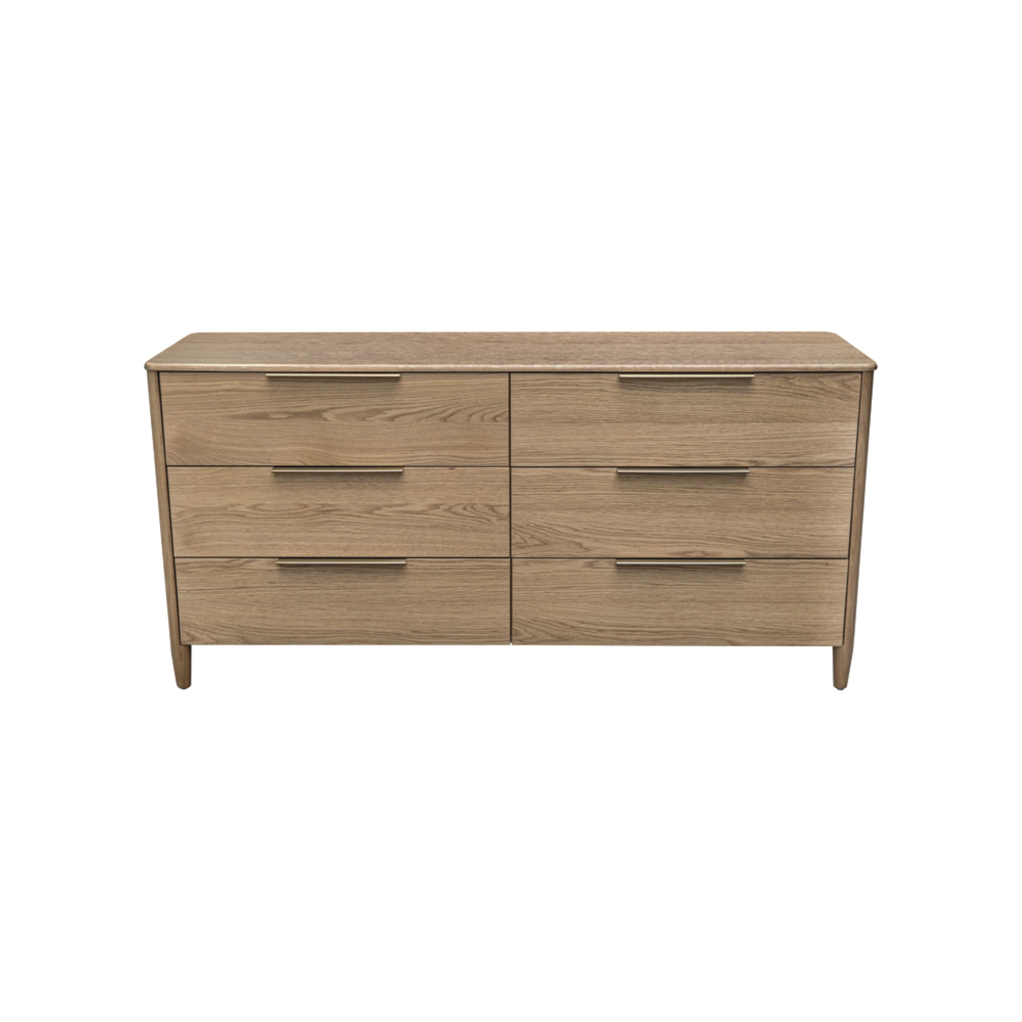 The Kamea 6 Drawer Dresser combines durable MDF construction with an elegant oak veneer finish, offering both strength and a natural aesthetic. Its rounded edges and tapered legs create a refined silhouette that enhances any bedroom decor while ensuring safety and style. This dresser provides ample storage with six spacious drawers, making it a practical and sophisticated addition to your home.