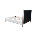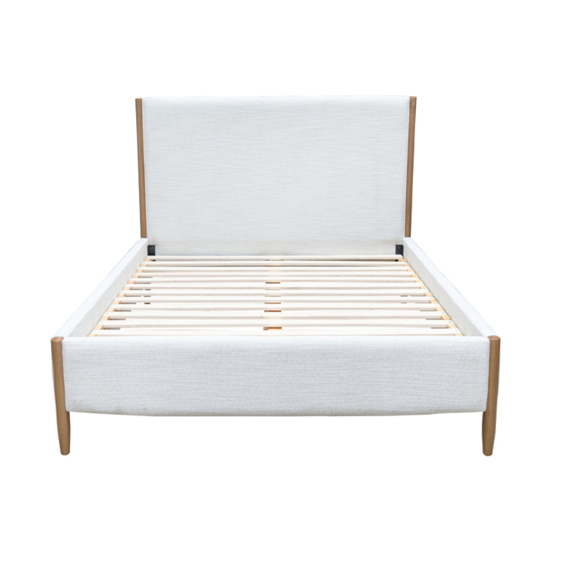 This upholstered bed is crafted for ultimate comfort, featuring a softly padded frame paired with warm oak hues to create a contemporary and inviting design.