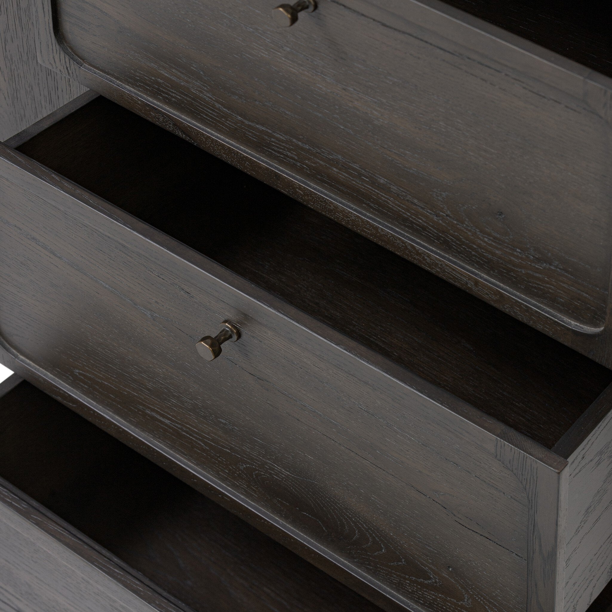 Modern Deco style meets a strong, traditional aesthetic. Each side has three drawers with rounded molding and hammered hardware, while a black oak finish with brown undertones reveals the wood's natural grain.