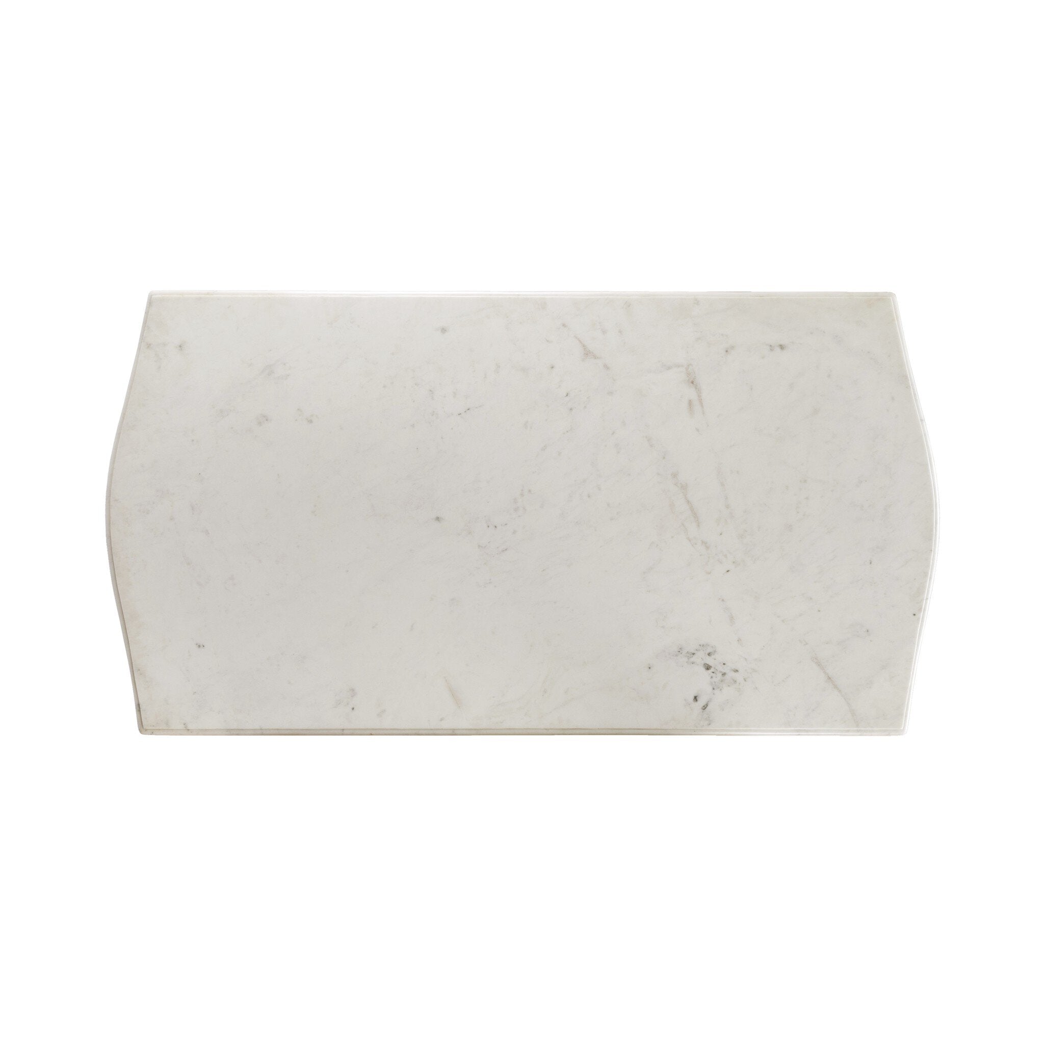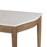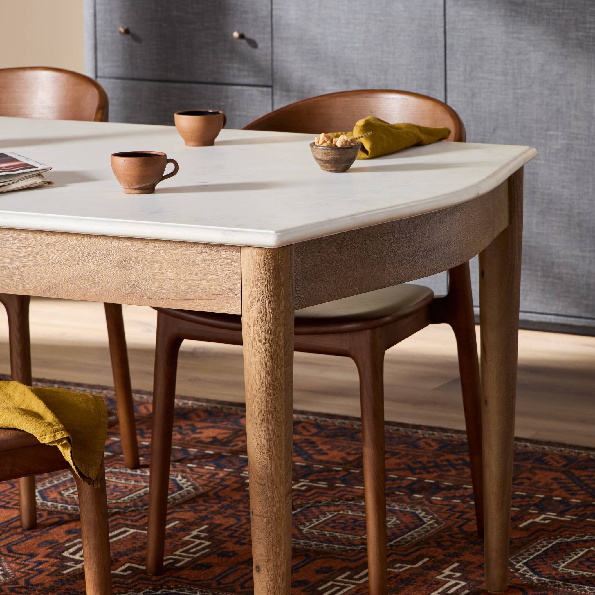 Elevate your dining space with this architectural statement piece featuring a striking white marble top adorned with reverse ogee detailing. Constructed from sustainably sourced mango wood with refined tapered legs, the table's compact proportions make it ideal for intimate gatherings without compromising on design sophistication. A harmonious blend of natural materials and geometric elegance.