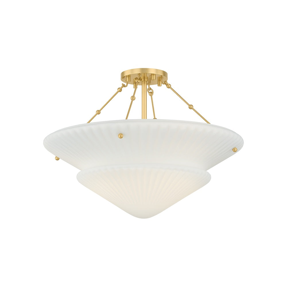 The Loburn Semi Flush draws from Art Deco influences, featuring a scalloped shade that serves as a calm centerpiece. Crafted from a single piece of opal glossy glass, the shade is expertly shaped to mimic two outward-fanning tiers resembling feathers. Supported by a sleek Aged Brass frame, this elegant and luminous fixture appears to effortlessly hover above.