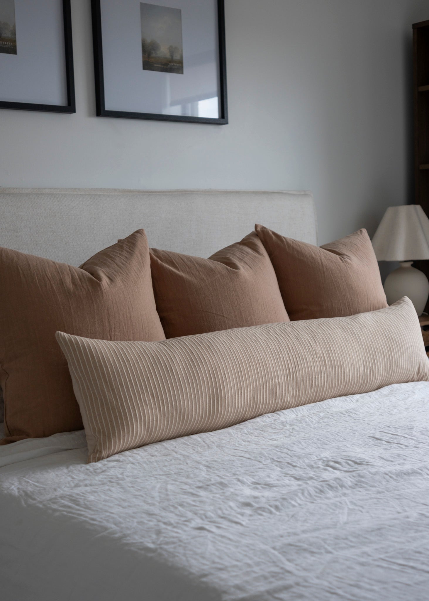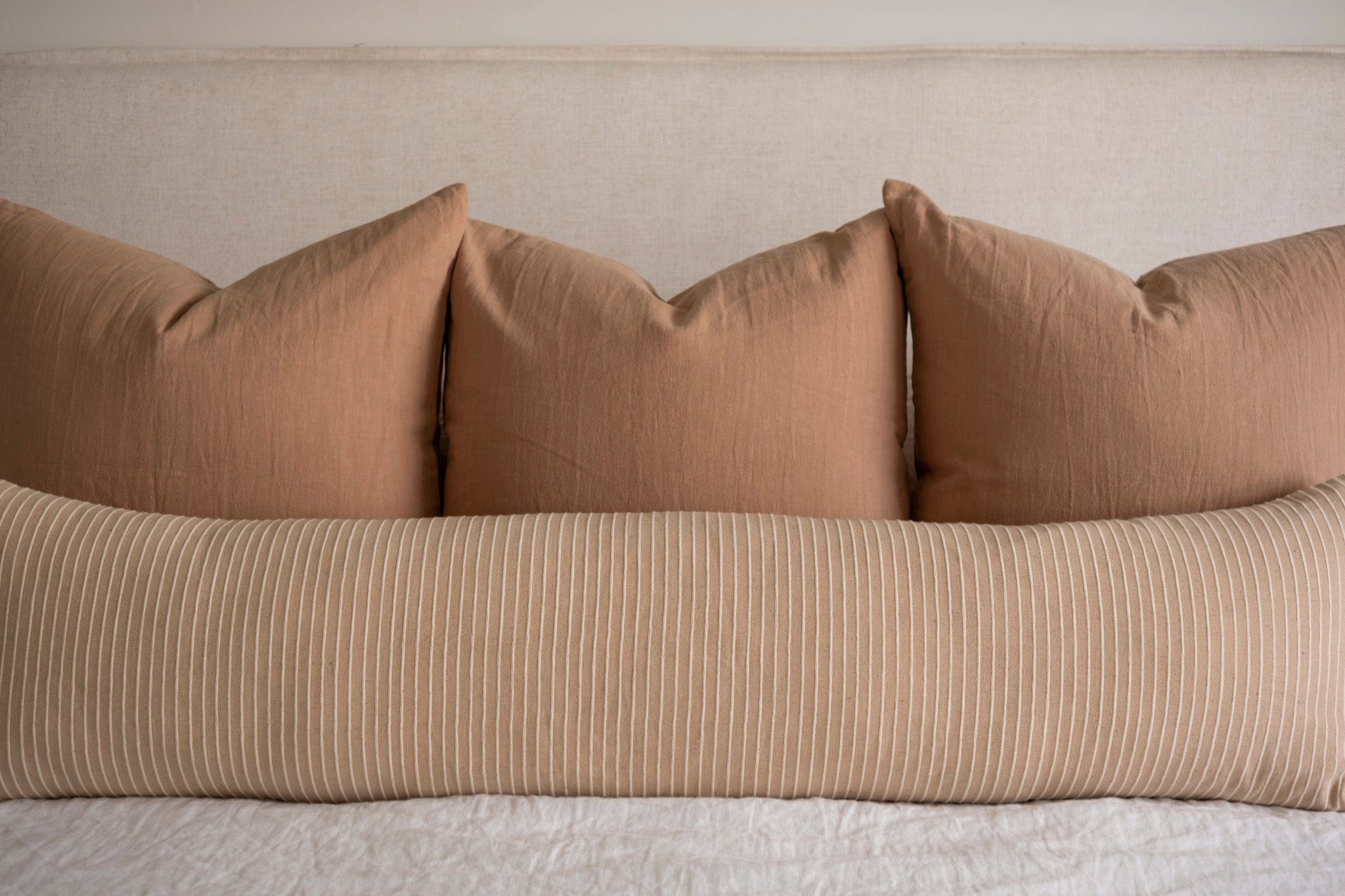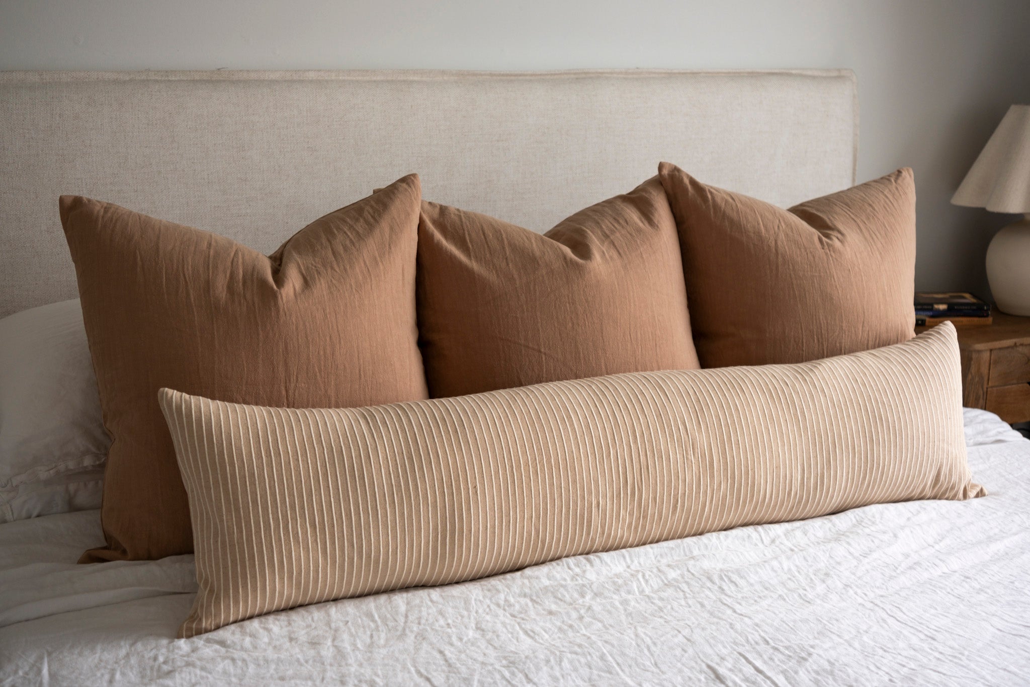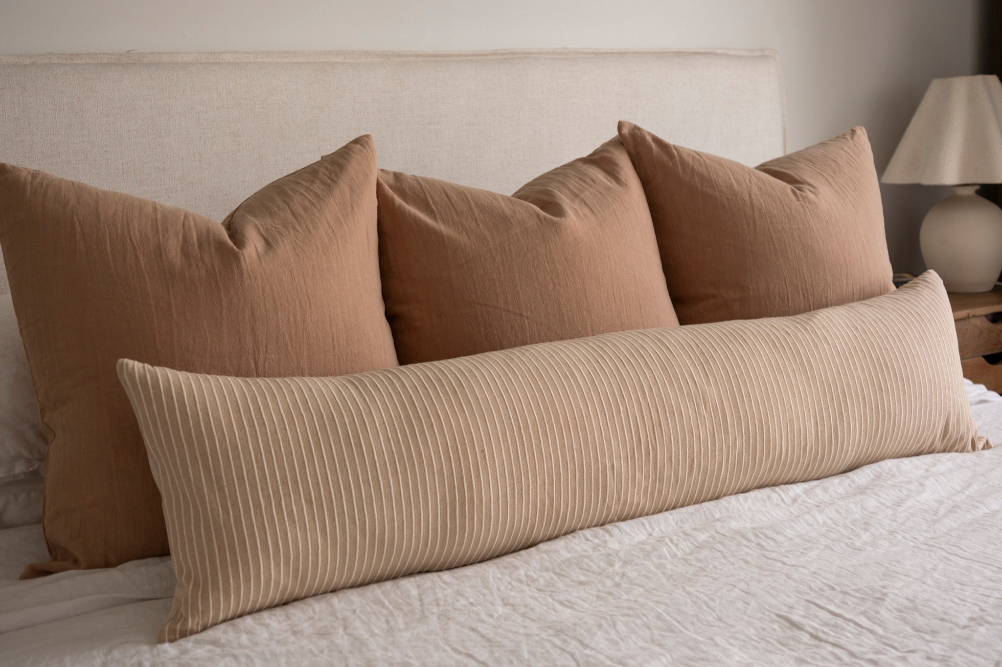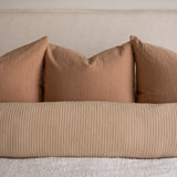 We are thrilled to introduce another fabric to our capsule collection of long lumbar pillow covers! Our Louis pillow cover is made with a soft brown cotton from Thailand and features a woven stripe in a creamy tone. Specifically designed for your bed, and now available in queen and king size dimensions, this textural neutral is a perfect fit for any bedroom space.