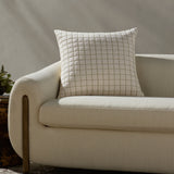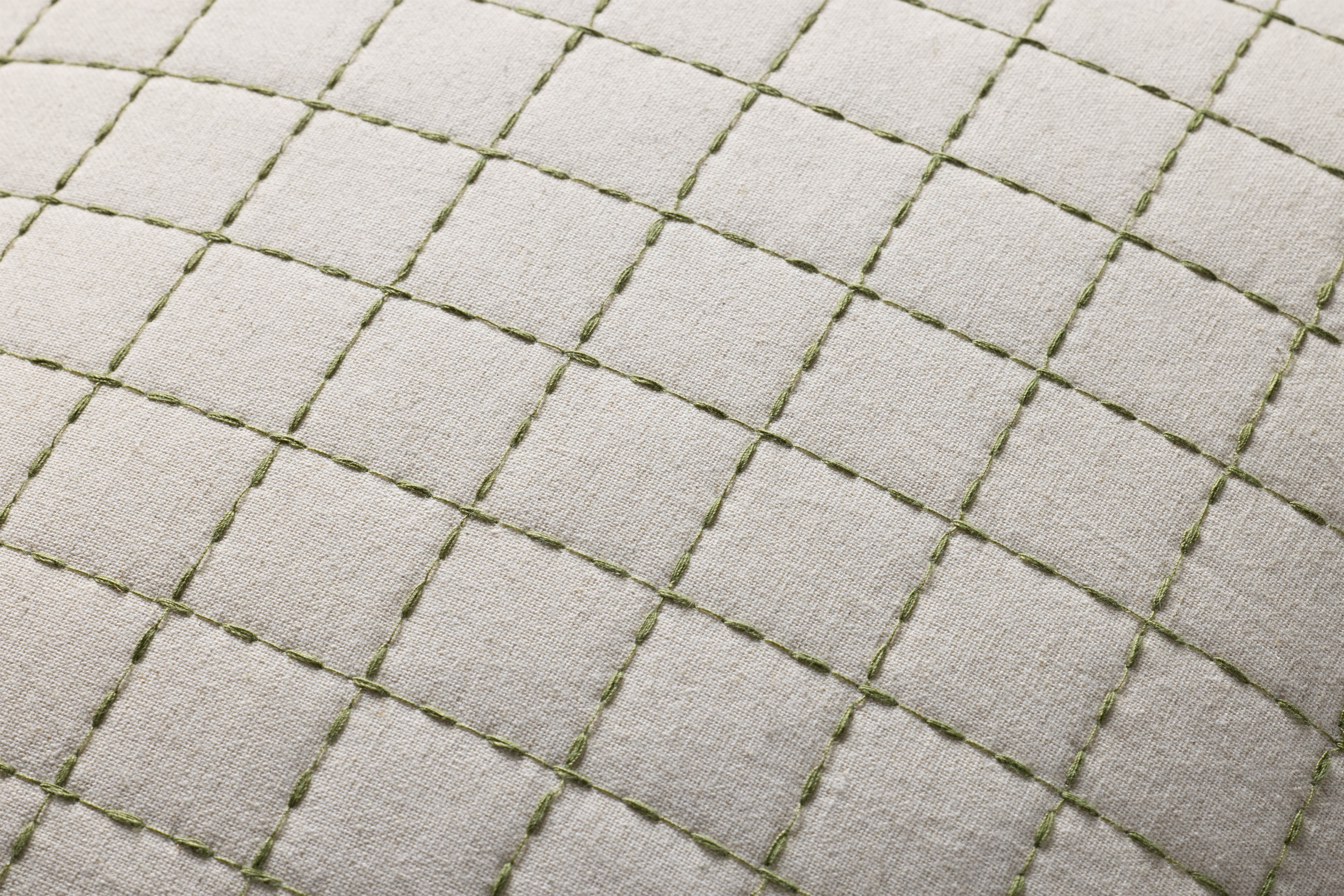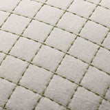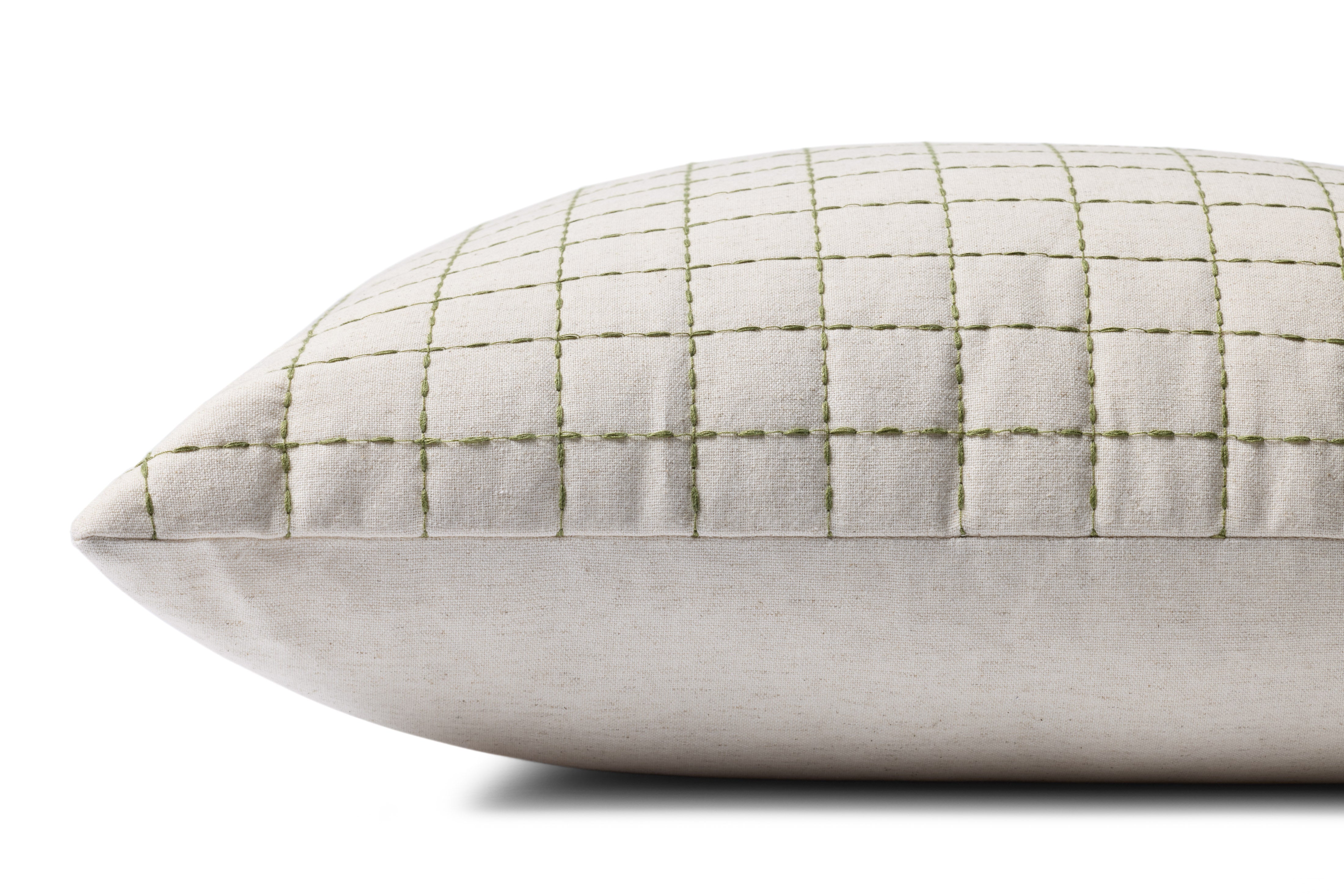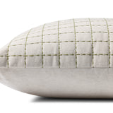 The Hattie throw pillow from Magnolia Home by Joanna Gaines x Loloi has a quilted design with green stitching against an ivory background, a timeless accent for traditional, farmhouse, or cottage home decor. The pillow cover is made of cotton, polyester, linen, and other fibers in India and measures 22” x 22”, a versatile size for living rooms and bedrooms.