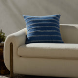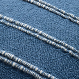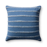The Landry throw pillow from Magnolia Home by Joanna Gaines x Loloi features raised blue and white stripes for traditional, farmhouse, or cottage home decor. The pillow cover is hand-woven of cotton and wool in India and measures 22” x 22”, a versatile size for living rooms and bedrooms.