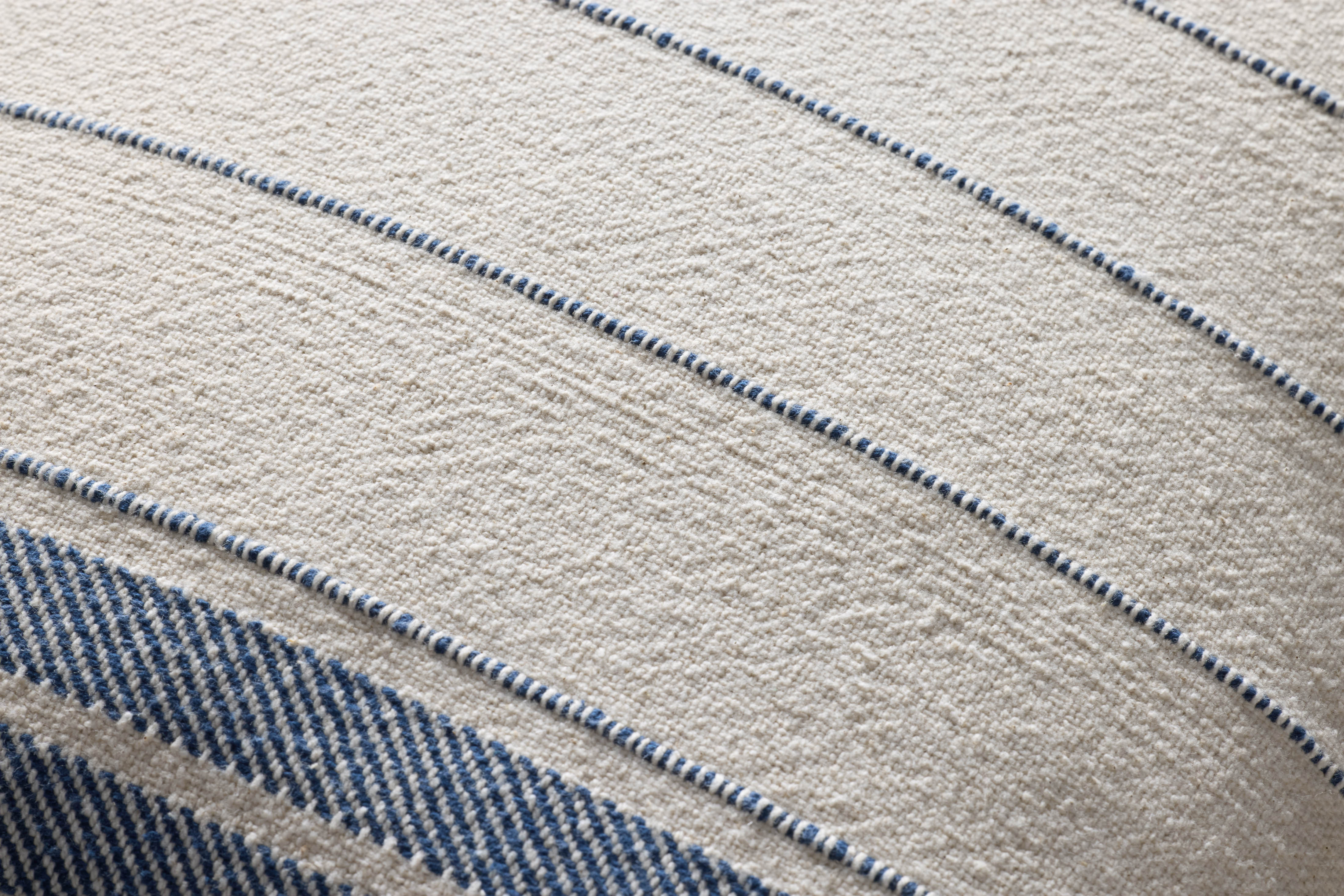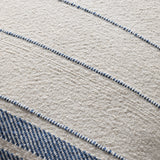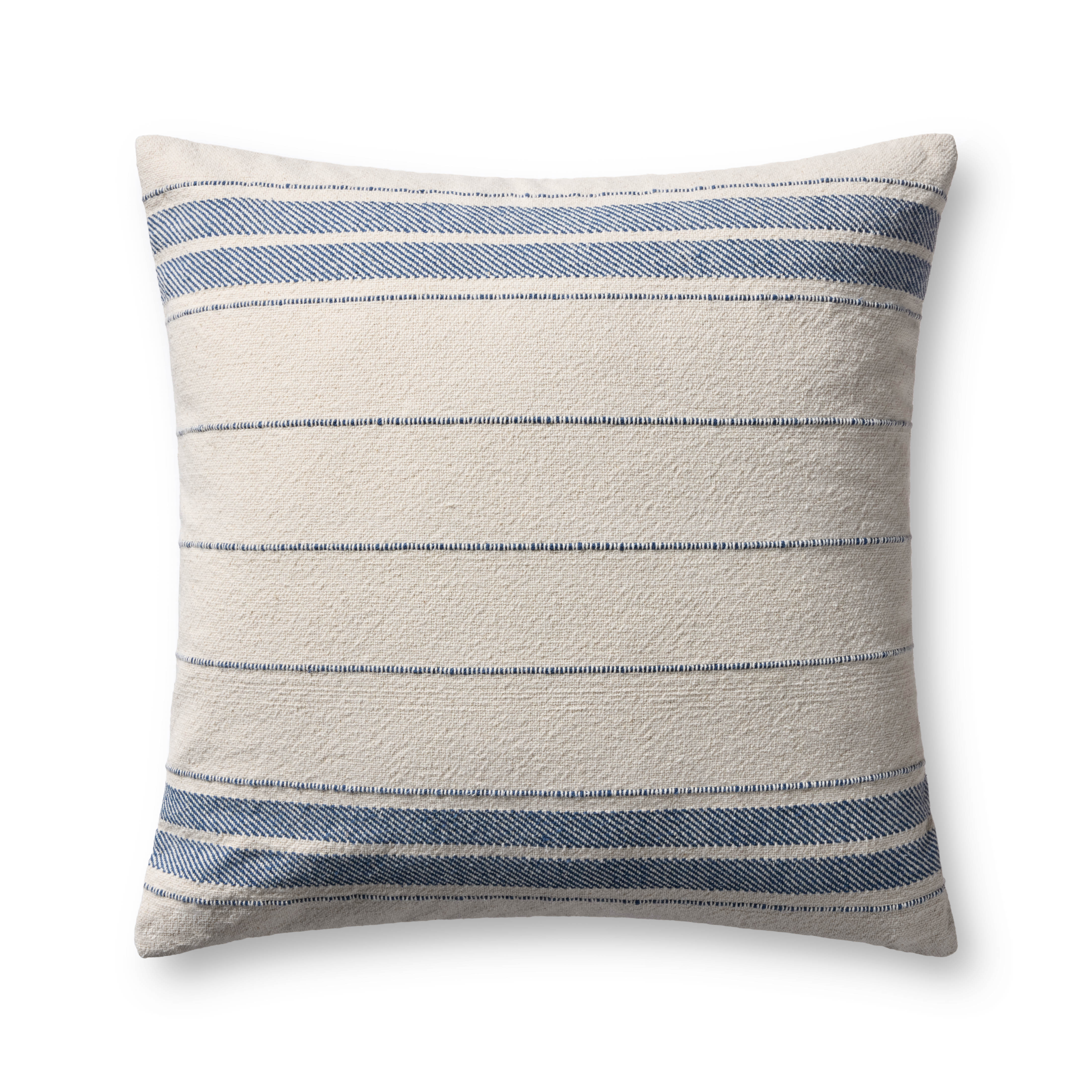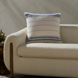 The Selena throw pillow from Magnolia Home by Joanna Gaines x Loloi features soft blue stripes against a natural beige background, reminiscent of vintage flour sacks. The pillow cover is hand-woven of 100% cotton in India and measures 22” x 22”, a versatile size for living rooms and bedrooms of all home decor styles.