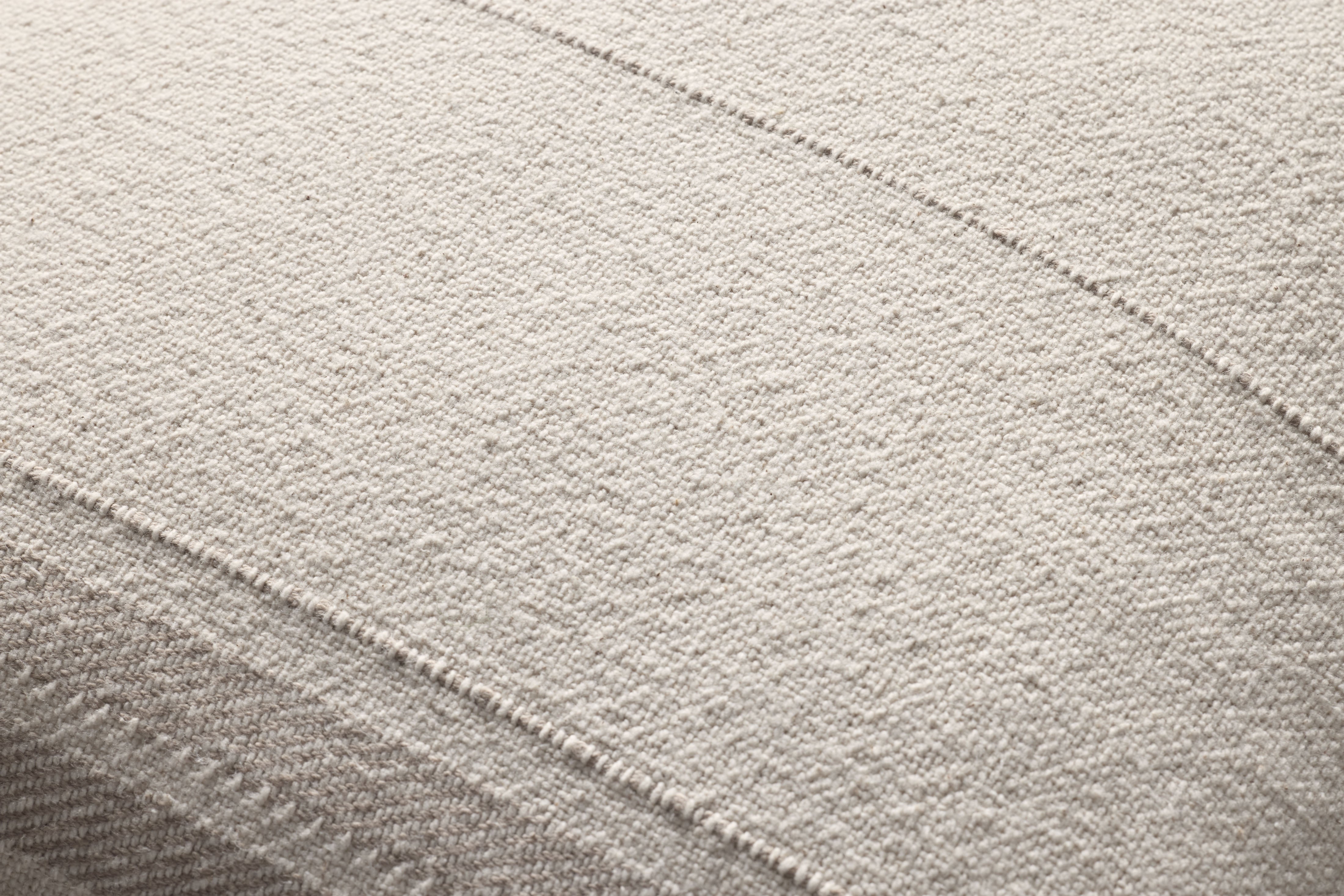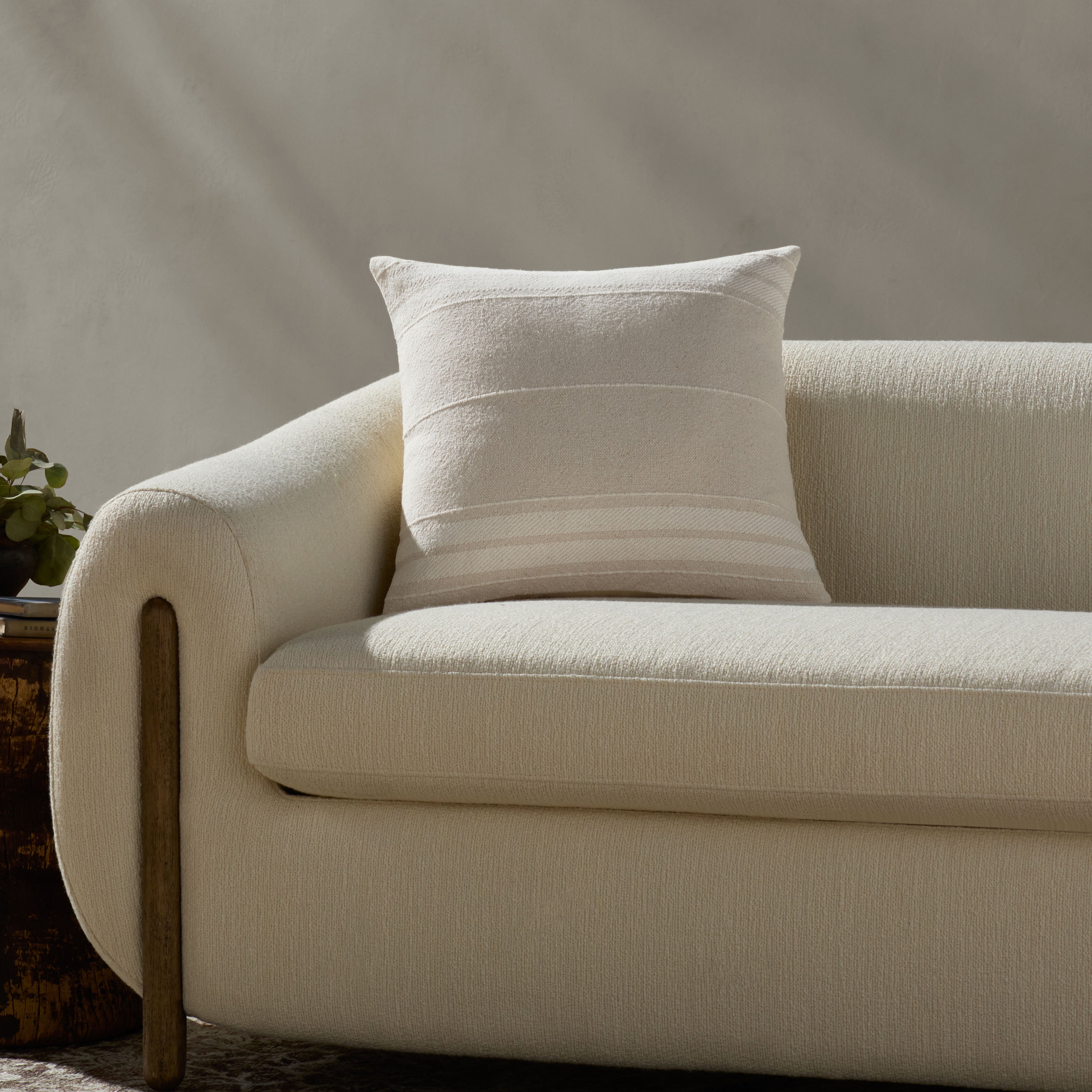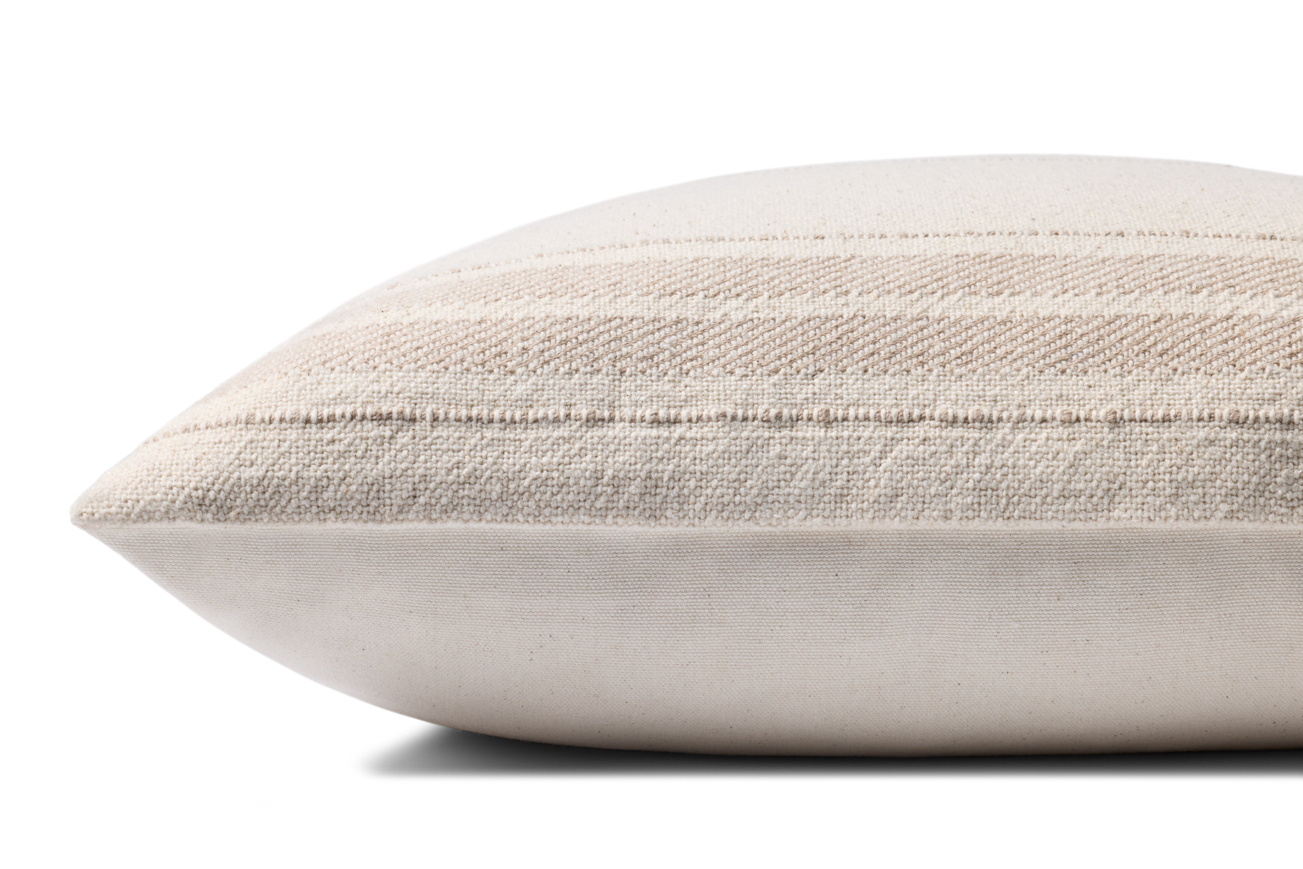 The Selena throw pillow from Magnolia Home by Joanna Gaines x Loloi features ivory and beige stripes against a natural beige background, reminiscent of vintage flour sacks. The pillow cover is hand-woven of 100% cotton in India and measures 18” x 18”, a versatile size for living rooms and bedrooms of all home decor styles.