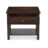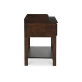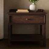 The Maria nightstand balances timeless scale with sleek, modern lines. Its elevated design is defined by delicate lip detailing and an open shelf that enhances both form and function. Crafted from solid mango wood and finished with brass-toned iron hardware, Maria offers a refined blend of classic character and contemporary style.