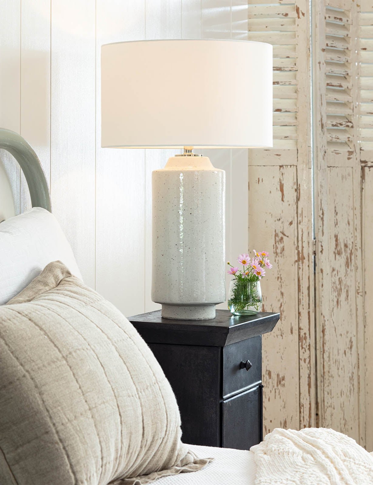 Simple yet impactful, the Markus Ceramic Table Lamp's modern body and polished nickel finish make it an extremely versatile luminary. The neutral ceramic body is embellished with a random freckled pattern. The crisp natural linen drum shade would fit just as well in a modern farmhouse living room as in a relaxed, coastal bedroom.