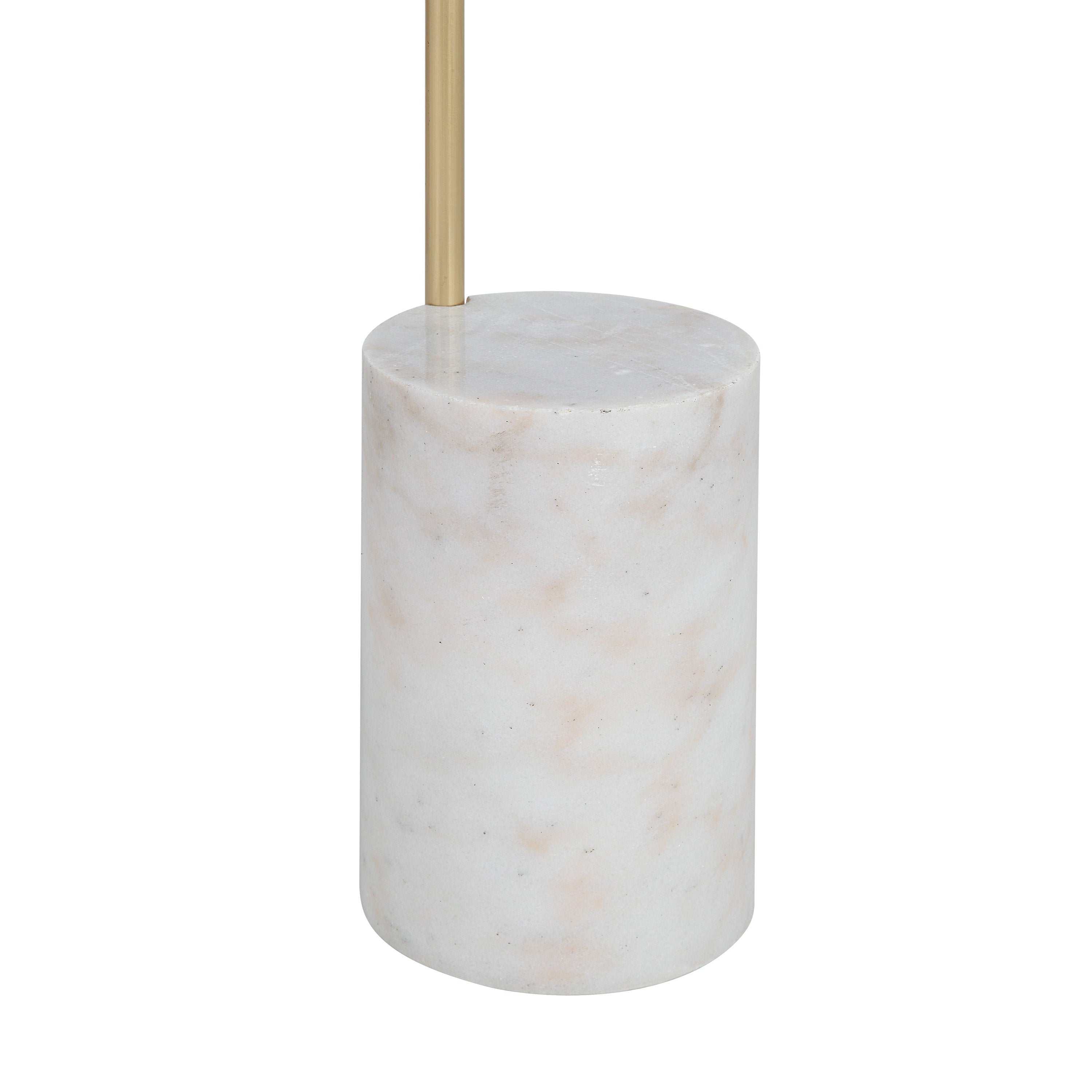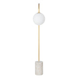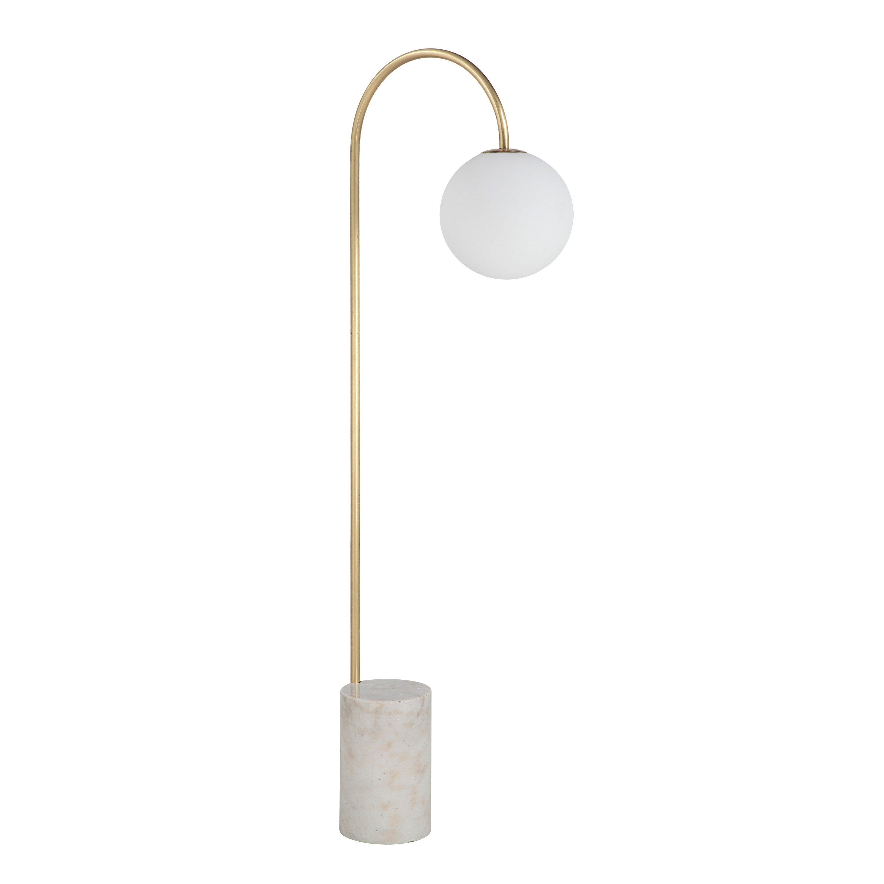 The Marlo Floor Lamp stands 62" tall with a satin brass finish and a white globe glass shade, adding elegant style to any room. It fits standard E26 bulbs up to 60W and features a convenient foot switch for easy control. Combining quality, design, and function, it enhances your space effortlessly.