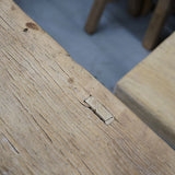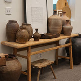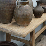 Our Vintage Elmwood Miller Console Table is a one-of-a-kind masterpiece, boasting a unique shape, distinct patina, and individual size. These tables have old souls, carrying with them the rich stories of the past. The enduring beauty lies in the mortise and tenon joints, expertly crafted to withstand the test of time, ensuring a sturdy piece of history that has lasted decades.