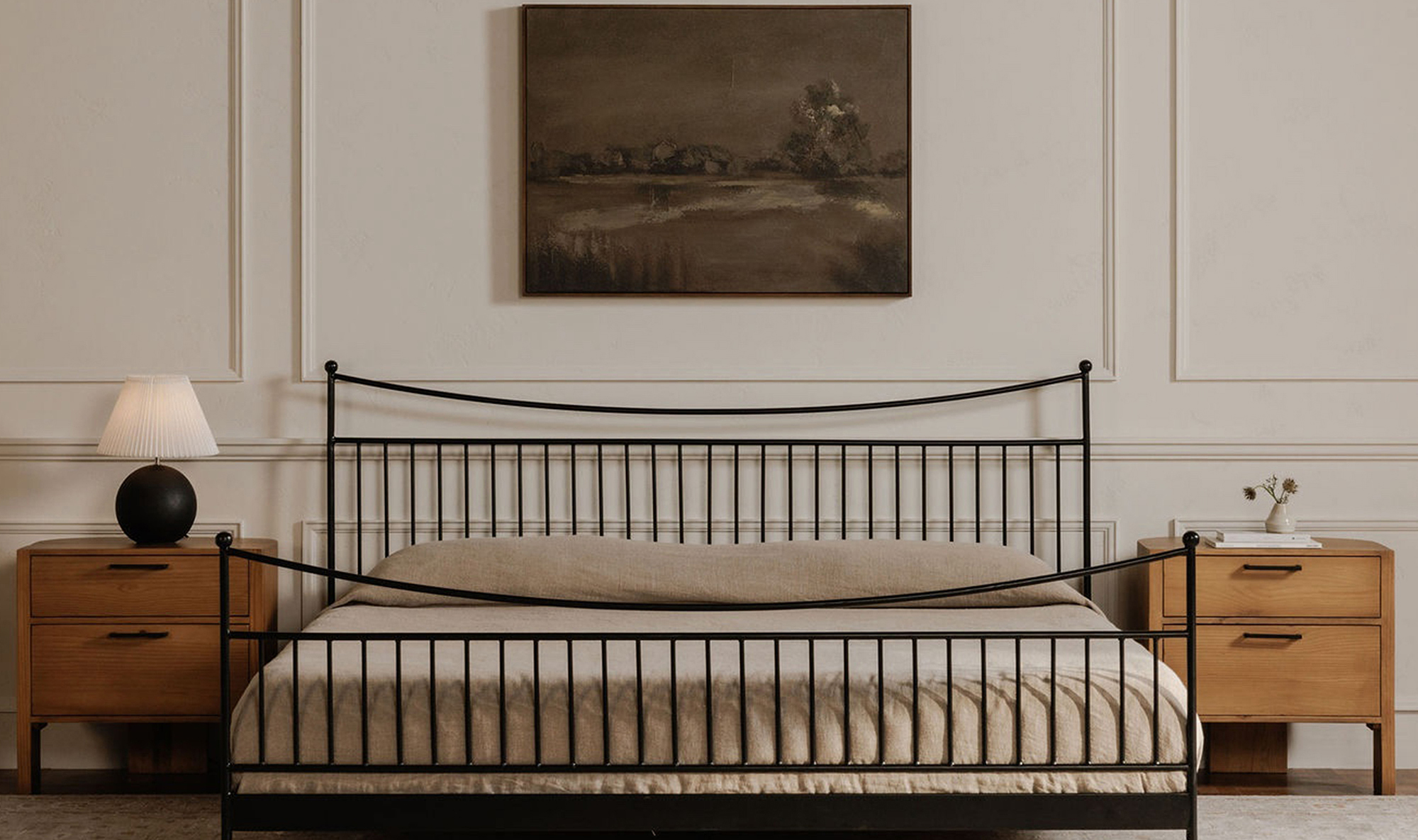 Experience the perfect blend of strength and beauty with our Moira Bed. Inspired by classic architecture, this bed features delicate curves and finial detailing. The traditional slatting on the headboard and footboard provides texture and depth, while the fusion of metal and softer materials creates a unique and elegant design. Upgrade your bedroom with the Moira Bed today!