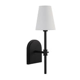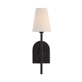 Incorporating layered lighting enhances both the style and utility of any interior setting. Offered in antique brass, matte black, or polished nickel finishes paired with a tapered off-white linen shade, this wall sconce features an arched backplate that gives it a contemporary twist, resulting in a design that is elegant and current.