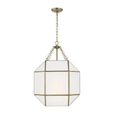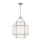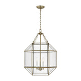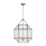 The Morrison Medium Three Light Lantern showcases a geometric design available in brass or nickel finishes. It features clear or milk glass panes, offering a refined balance of classic and modern aesthetics to enhance any space with sophisticated illumination.