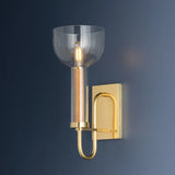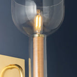 This design-forward sconce bridges modern and transitional elements. The upturned half-dome clear glass shade melds into a longer glass tube, revealing a tight rattan wrap around the stem. Supported by a looping stem finished in Aged Brass, it is the perfect usable everyday staple with eye-catching style details.