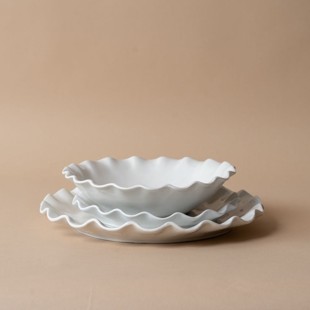 Indulge in this stunning dining collection, featuring delicately crafted white-washed stoneware inspired by the natural beauty of seashells and ocean waves. With its organic design, it is perfect for mixing and matching with any of your other collected dining pieces, creating a truly captivating gathering experience.