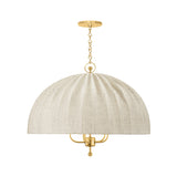 Textural and bold yet inherently soft, the Palmetto family plays with materiality and scale. The voluminous, parasol-like shade is woven from natural silk with sculptural pleats that become more prominent when illuminated. Available as a pendant in two sizes and a lantern, Palmetto’s oversized silhouette adds quiet drama to dining spaces, larger bathroom vanities, and cozy banquettes. The floor lamp brings the same depth to lounge spaces, reading nooks, and dens. The Aged Brass metalwork complements the vintage-inspired nature of the design.